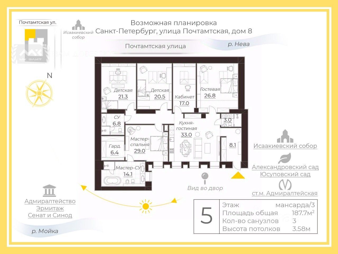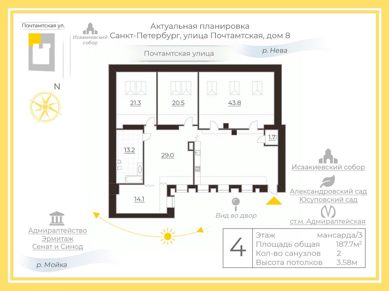Арт. 127613596 Эксклюзивное владение историей в 187 м² с видом на Исаакиевский собор. Представляем к приватной продаже исключительный лот — мансардную квартиру-ателье площадью 187 м² в самом сердце имперского Петербурга. Это не просто жилое пространство, это шанс обрести фамильное гнездо в историческом доме К.Н. Корфа (1831 г., арх. Е.Т. Цолликофер) на Почтамтской улице, 8. Дом, переживший несколько бережных реконструкций, сохранил аутентичный дух эпохи. Вы оцените подлинную лепнину в парадной петербургского образца, массивные стены и ауру тихой, непрерывной истории. В двух шагах — величественный Исаакиевский собор, Адмиралтейство, набережные Мойки. Вы не просто будете жить в центре — Вы станете его частью. Мансардный этаж здесь— это синоним уединения и света. Высокие окна заливают двухуровневое пространство северным сиянием, а избранные ракурсы открывают тот самый ''секретный'', интимный вид на золотой купол Исаакиевского собора — Ваш личный диалог с символом города. Просторные залы с безупречными пропорциями готовы воплотить самые смелые архитектурные и интерьерные решения. Редкие преимущества: В дополнение к историческому фасаду, дом предлагает редкую для центра опцию — тихий, охраняемый двор с приватными парковочными местами. Это островок спокойствия и приватности в эпицентре культурной жизни. Это предложение — для тех, кто ищет не метры, а наследие. Не просто квартиру, а точку отсчета для новой семейной истории. Для лучшего восприятия возможностей пространства, в некоторых изображениях использованы AI-визуализации интерьера. Мы готовы организовать приватный показ в удобное для Вас время.