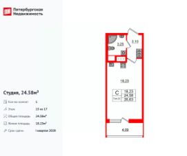 Продается уютная студия от застройщика в жилом комплексе ''Setl Ривьера'' в активно развивающимся Невском районе.До метро можно добраться на транспорте всего за 10 минут.Удобная, классическая, функциональная европланировка, вместительная прихожая 3.09 м². Общая площадь студии - 24.5 м², жилая 18.17 м², высота потолка 2.77 м.Квартира продается с отделкой ''NORD LINE SILVER ВК NEW''.Что особенного в ЖК ''Setl Ривьера''?• Первая береговая линия Невы. 5 км до центра Петербурга• ''Активити парк'' - пространство для занятий спортом и отдыха. ''Ривьера парк'' с променадом и панорамной ротондой• Масштабные дворы 10 000 кв.м. с авторским ландшафтным дизайном• Двухуровневые единые входные группы• Видовые квартиры с террасами, каминами и саунами
