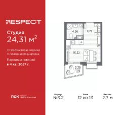 Просторная 1-комн. квартира-студия с предчистовой отделкой в ЖК ''RESPECT'' на 8 этаже. Общая площадь: 24.31 кв.м., площадь гостиной 15.3 кв.м., из которых 5 кв.м. выделено под кухонную зону. Все окна выходят на одну сторону. В квартире один балкон, один совмещенный санузел. Высота потолков 2.7 м. Дом монолитный, многоподъездный, переменной этажности, от 10 до 13 этажей. Квартира находится в 1-й секции высотой 13 этажей в корпусе 3.2. На этаже 5 квартир. В подъезде 1 пассажирский и 1 грузовой лифт. Начало строительства - 3 квартал 2025 года. Окончание строительства - 4 квартал 2027 года. Оформление сделки по договору долевого участия. В шаговой доступности от жилого комплекса находятся станции метро (расстояние по прямой): ''Лесная'' (800 м), ''Площадь Мужества'' (1.4 км), ''Выборгская'' (1.9 км), также недалеко от этого корпуса находятся станции метро: ''Академическая'', ''Политехническая''. Жилой квартал ''RESPECT'' строится на Полюстровском пр, 87, в одной из самых востребованных локаций Петербурга. В 10 минутах пешком - метро ''Лесная'' и в 10 минутах на транспорте - Петроградская сторона. Высота домов от 7 до 13 этажей. Квартиры сдаются с отделкой white box и с чистовой отделкой. На территории Respect строится школа на 1125 учащихся и детский сад на 240 мест. Запроектированы собственная газовая котельная, закрытая территория, дворы без машин и подземные паркинги с лифтами.В проекте предусмотрены трапециевидные балконы или остекленные лоджии, которые, с одной стороны, исключают монотонность фасада, являясь декоративными элементами, с другой дополнительным функциональным пространством в квартирах. Цветовая гармония фасадов каждого дома раскрывает характер квартала. Коричневый цвет клинкерного кирпича со структурой водяных штрихов — цвет уюта и безопасности, сдержанности и надёжности. Вентилируемые фасады облицованы клинкерным кирпичом. Его высокая прочность позволяет давать 100 лет гарантии на этот материал. Водопоглощение клинкерного кирпича составляет менее 5%, за счет чего у него высокая теплопроводность и прочность. В квартале запроектированы внутренние закрытые территории дворов домов без доступа автомобилей и безбарьерная среда для велосипедистов и колясок. Предусмотрены IP-домофония с функцией дистанционного открывания калиток и парадных, а также дистанционный сбор показаний счетчиков и мобильное приложение для жителей. Для безопасности жителей квартала - круглосуточное видеонаблюдение и служба охраны. В каждой квартире предусмотрены внешние корзины для кондиционеров. Вся территория квартала будет связана единой концепцией благоустройства, разработанной ландшафтным бюро L.BURO. На эксплуатируемой кровле на уровне первого этажа в домах 1 и 4 будут обустроены общественные видовые террасы. Это станет не только привлекательным местом с красивым видом, но и удобным, многофункциональным пространством. Дизайн парадных зон и входных групп - сочетание лаконичности отделки и декоративных элементов с текстурами из натурального камня и дер