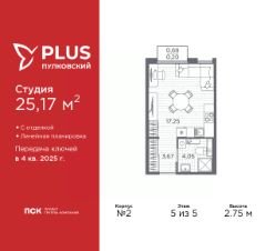 Просторная 1-комн. квартира-студия с отделкой в ЖК ''PLUS Пулковский'' на 5 этаже. Общая площадь: 25.17 кв.м., площадь гостиной 17.25 кв.м., из которых 5 кв.м. выделено под кухонную зону. Все окна выходят на одну сторону. В квартире один балкон, один совмещенный санузел. Высота потолков 2.75 м. Все квартиры в проекте сдаются с полной чистовой отделкой. Выполняется в двух стилистических решениях светлый стиль и темный современный стиль. Вам остается только расставить мебель.Важное преимущества отделки от застройщика в гарантии на все работы и в том, что фактическая стоимость полной отделки распределяется в ипотечных платежах при покупке в ипотеку. Дом монолитный, многоподъездный, высотой 5 этажей. Квартира находится в 3-й секции в корпусе 2. На этаже 9 квартир. В подъезде 1 грузовой лифт. Начало строительства - 4 квартал 2023 года. Окончание строительства - 4 квартал 2025 года. Оформление сделки по договору долевого участия. Уютный пятиэтажный city квартал PLUS Пулковский расположен в престижном Московском районе на пересечении Пулковского и Волхонского шоссе в новом формирующемся микрорайоне. Рядом проходит одна из важнейших транспортных артерий города Пулковское шоссе, а в 10 минутах езды два въезда на КАД и въезд на ЗСД. Благодаря удобному и быстрому выезду на Пулковское шоссе, можно легко добраться до центра города за 35 мин. До станций метро ''Московская'' и ''Купчино'' - 15 мин. на машине, а до аэропорта Пулково - 17 мин. В составе квартала: 30 пятиэтажных домов, школа со спортивным стадионом, 2 детских сада с бассейнами, наземные и подземные паркинги, центральный зеленый бульвар с play hub и местами отдыха. Благоустройство квартала продумано до мельчайших деталей, в его основе - забота о качестве жизни каждого жителя. Дома возводятся по современной монолитной технологии строительства с вентилируемыми фасадами. Благодаря большим увеличенным окнам и отсутствию высокоэтажных домов, во всех квартирах максимальный объем естественного света. В составе квартала запланированы социально-значимые объекты: школа на 825 мест со спортивным стадионом и бассейнами, два детских сада с бассейнами на 220 мест каждый. Территория квартала зонирована таким образом, чтобы автомобильные и пешеходные потоки и не пересекались. Прогулочные и велосипедные дорожки отделены от автомобильных проездов зелеными насаждениями. Дворы закрыты для машин, что дает чувство дополнительной безопасности для жителей особенно, для самых маленьких. Вся территория квартала безбарьерная. Здесь нет пандусов, резких перепадов высот или неудобных ступеней. Вход в парадные с уровня земли. В каждом дворе есть своя оборудованная детская площадка. А в центре микрорайона расположится большая игровая площадка play hub с пространством для командных игр. PLUS Пулковский располагается в молодом микрорайоне, который сейчас находится в стадии активного развития. Он будет обладать собственной развитой инфраструктурой. В радиусе 15 минут езды на автомобиле располагают