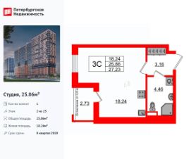Продается просторная студия от застройщика в жилом комплексе ''Город звезд'' в новом городе на правом берегу Невы.До метро можно добраться на транспорте всего за 13 минут.Удобная, классическая, функциональная европланировка, вместительная прихожая 3.16 м². Общая площадь студии - 25.86 м², жилая 18.24 м², высота потолка 2.77 м.Квартира продается с отделкой ''NORD LINE SILVER''.Что особенного в ЖК ''Город звезд''?• Инновационный Лицей Setl с оригинальной архитектурной концепцией и уникальной образовательной средой• Невский лесопарк под окнами - всегда свежий воздух и полноценный отдых на природе• Четыре тематические площади отдыха с разнообразным благоустройством• Аллея Звёзд - променад протяженностью 5 км с ландшафтным озеленением, зонами отдыха и велодорожкой• Выход на набережную реки Утки, где можно порыбачить или взять напрокат лодку• Единая входная группа с ресепшен и подземный паркинг