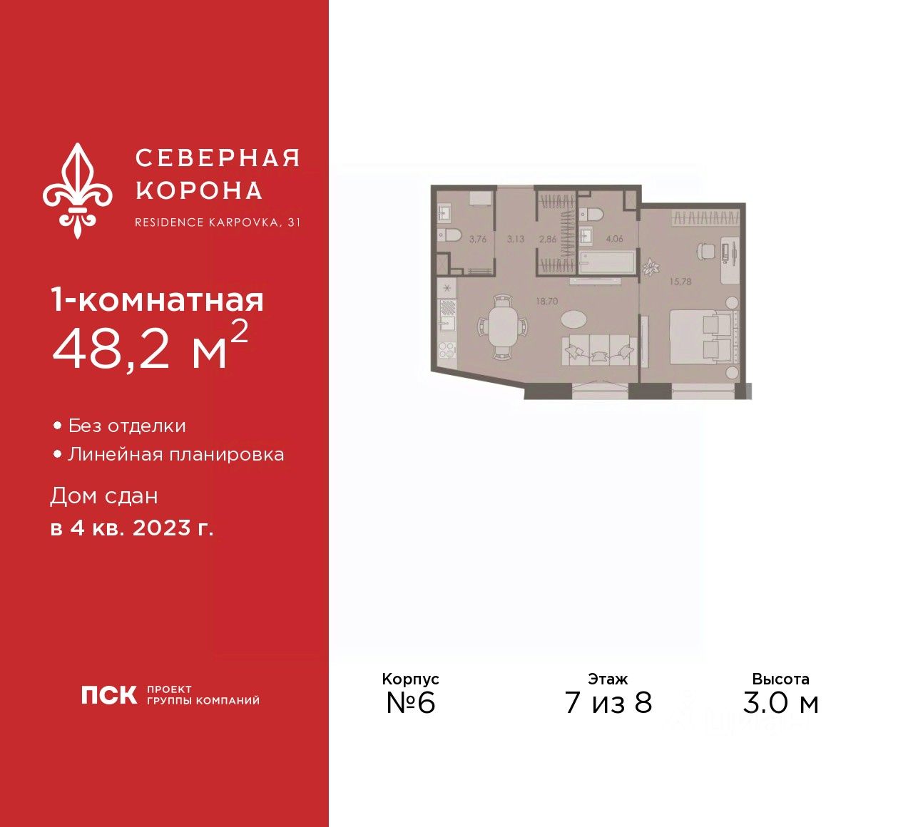 1-комн. квартира в ЖК ''Северная корона'' на 7 этаже. Квартира без отделки, после оформления собственности можно делать ремонт. Общая площадь: 48.2 кв.м., жилая: 15.78 кв.м., площадь просторной кухни-столовой: 18.7 кв.м. Все окна выходят на одну сторону. В квартире один совмещенный и один раздельный санузел. Высота потолков 3.0 м. Квартира находится в корпусе 6. Дом монолитный, одноподъездный, высотой 8 этажей. На этаже 6 квартир. В подъезде 1 грузовой лифт. Строительство завершено, дом сдан в 4 квартале 2023 года. Оформление сделки по договору купли-продажи. В шаговой доступности от жилого комплекса расположены станции метро (расстояние по прямой): ''Петроградская'' (500 м), ''Чкаловская'' (1.3 км), ''Горьковская'' (1.7 км), ''Чёрная речка'' (1.7 км), также недалеко от этого корпуса находятся станции метро: ''Чернышевская'', ''Спортивная''. Премиальный жилой комплекс ''Северная корона'' расположился в парадной части Петроградской стороны на пересечении ее главного проспекта — Каменноостровского и набережной реки Карповки. Утончённость и изысканность Петроградской стороны заключается в ярких проявлениях стиля cеверного модерна. Архитектура премиального дома ''Северная корона'' — это современное воплощение и новое развитие архитектуры северного модерна. Особенность и уникальность дома в его протяженности вдоль реки Карповки. Фасад исключает монотонность, линии интегрированы в канву курдонера и внутренних общественных пространств, обращённых как в сторону Каменноостровского проспекта, так и Иоановского монастыря. Все квартиры в полной мере можно назвать видовыми они открыты историческому окружению и ландшафтной архитектуре. Что дарит владельцам единственные в своем роде захватывающие виды. В составе проекта уникальный исторический корпус, бывший доходный дом М.К. Покотиловой. Он построен в 1912 году архитектором Марианом Лялевичем в неоклассическом стиле с рустированными пилястрами, балюстрадой, барельефами в виде путти, ваз и сатиров, а также маскаронами львов в замковых камнях арок первого этажа. Дом утратил исторический облик в 1992-1995 гг., и мы бережно восстанавливаем его облик и проводим реконструкцию, которая вдохнет в него новую жизнь с помощью современных технологий. Этажность: 4 - 9 этажей. Дом СДАН. Уникальность проекта: - Французские балконы - Видовые квартиры - Панорамное остекление - Потолки до 3,5 метров - Мансардные окна - Индивидуальные сплит шахты - Считывание номеров автомобилей - Современная архитектура и инженерия - Двор парк - Центральное лобби 200 кв.м. #z554us