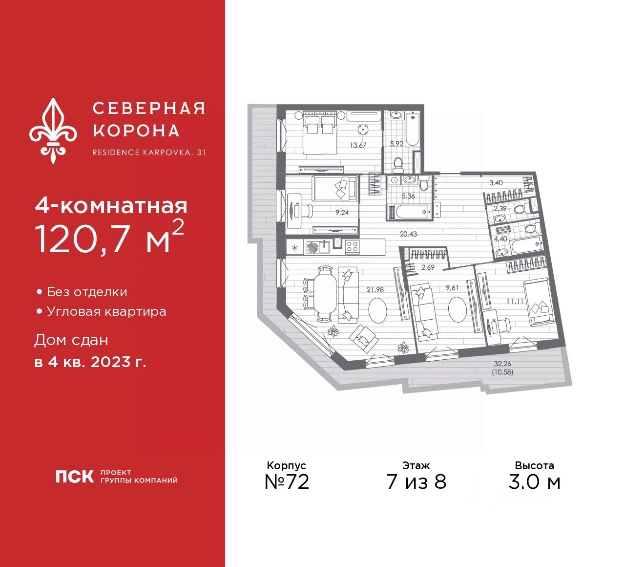 Продается четырехкомнатная квартира в ЖК ''Северная корона'' на 7 этаже. Квартира без отделки, полностью готова к чистовой отделке и дальнейшему ремонту. Общая площадь: 120.7 кв.м., жилая: 43.63 кв.м., площадь просторной кухни-столовой: 21.98 кв.м. Квартира угловая, очень светлая, естественная вентиляция при открытии окон. В квартире один балкон, три совмещенных и один раздельный санузел. Наличие террасы площадью 32.26 кв.м. в квартире дает возможность для создания зон отдыха в кругу семьи и друзей. Высота потолков 3.0 м. Квартира находится в корпусе 7.2. Дом монолитный, одноподъездный, высотой 8 этажей. На этаже 4 квартиры. В подъезде 1 грузовой лифт. В настоящее время строительство окончено, дом сдан в 4 квартале 2023 года. Оформление сделки по договору купли-продажи. В шаговой доступности от жилого комплекса находятся станции метро (расстояние по прямой): ''Петроградская'' (500 м), ''Чкаловская'' (1.3 км), ''Горьковская'' (1.7 км), ''Чёрная речка'' (1.7 км), также недалеко от этого корпуса расположены станции метро: ''Чернышевская'', ''Спортивная''. Премиальный жилой комплекс ''Северная корона'' расположился в парадной части Петроградской стороны на пересечении ее главного проспекта — Каменноостровского и набережной реки Карповки. Двухсотметровое парадное лобби, дизайнерский ландшафт, собственная фитнес-студия, парадная гостиная для встреч и переговоров, игровой клуб для детей. А также: системы очистки и подготовки воды и воздуха, консьерж-сервис, бесключевой доступ, помещения для ожидания и многое другое. Архитектура премиального дома ''Северная корона'' — это современное воплощение и новое развитие архитектуры северного модерна. Особенность и уникальность дома в его протяженности вдоль реки Карповки. Фасад исключает монотонность, линии интегрированы в канву курдонера и внутренних общественных пространств, обращённых как в сторону Каменноостровского проспекта, так и Иоановского монастыря. Все квартиры в полной мере можно назвать видовыми они открыты историческому окружению и ландшафтной архитектуре. Что дарит владельцам единственные в своем роде захватывающие виды. Этажность: 4 - 9 этажей (в т.ч. 1 подземный) Дом СДАН. Класс проекта: Премиум класс Уникальность проекта: - Французские балконы - Видовые квартиры - Панорамное остекление - Потолки до 3,5 метров - Мансардные окна - Индивидуальные сплит шахты - Считывание номеров автомобилей - Современная архитектура и инженерия - Двор парк - Центральное лобби 200 кв.м. #2Uawuw