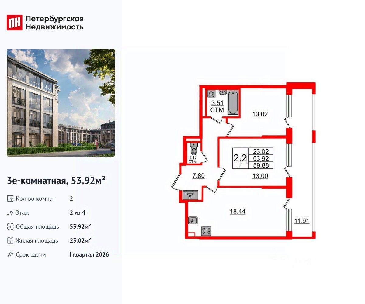 Продается уютная 2-комнатная квартира от застройщика в жилом комплексе ''Дворцовый фасад'' в неповторимом Петродворцовом районе. До метро можно добраться на транспорте всего за 25 минут. Удобная, классическая, функциональная европланировка, большая кухня-гостиная 18.44 м², просторная прихожая 7.8 м². Общая площадь квартиры - 53.92 м², жилая 23.02 м², высота потолка 2.75 м. Квартира продается с отделкой ''Норд Лайн серый''. Что особенного в ЖК ''Дворцовый фасад''? • В окружении дворцово-парковых ансамблей: Стрельна, Константиновский дворец, Петергоф, парк Новознаменка и Сосновая поляна, Шунгеровский лесопарк • Два собственных парка: парадный верхний для спокойного отдыха, нижний для активных занятий • Проект, соответствующий стандартам экологичного строительства, энергоэффективности, экономии и комфорта • Квартиры с саунами, возможностью установки камина и палисадниками • Малоэтажный жилой комплекс: всего 4 этажа, более половины квартир с увеличенной высотой потолка: от 3 до 5,5 м