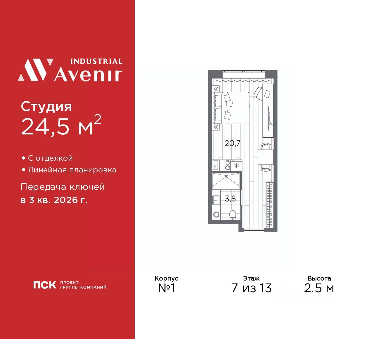 Однокомнатные апартаменты-студия с отделкой в ЖК ''Industrial AVENIR'' на 7 этаже. Общая площадь: 24.5 кв.м., площадь гостиной 20.7 кв.м., из которых 5 кв.м. выделено под кухонную зону. Все окна выходят на одну сторону. В апартаментах один совмещенный санузел. Высота потолков 2.5 м. Апартаменты находятся в корпусе 1. Дом монолитный, одноподъездный, высотой 13 этажей. На этаже 64 квартиры. В подъезде 3 пассажирских и 3 грузовых лифта. Окончание строительства - 3 квартал 2026 года. Оформление сделки по договору долевого участия. В шаговой доступности от дома имеются станции метро (расстояние по прямой): ''Кировский завод'' (300 м), ''Автово'' (1.6 км), также недалеко от этого корпуса расположены станции метро: ''Нарвская'', ''Ленинский Проспект'', ''Балтийская''. 13ти этажное здание апарт-отеля строится по монолитной технологии. В номерном фонде 739 апартаментов, в том числе юниты с террасами и в формате ''евро 2'', офисные и коммерческие помещения, оборудованный коворкинг, подземный паркинг. На первом этаже лобби 160 кв.м. с рецепшн, выставочным пространством, кафе и гостевой зоной. Окончание строительства апарт - отеля - III квартал 2026 года. Оформление сделки по договору долевого участия. Семейная ипотека на апартаменты не распространяется. ОТДЕЛКА Все апартаменты сдаются с полной чистовой отделкой, выполненной в концептуальном индустриальном стиле. Стены оформлены обоями под покраску в сером оттенке. Одна из стен акцентная - с декоративной штукатуркой, имитирующей бетон. Элементы черного металла представлены в трековых светильниках, дверной фурнитуре и сантехнике. На полу уложен износоустойчивый ламинат с деревянной фактурой. Еще одним элементом индустриального стиля в отделке апартамента является крупноформатный керамогранит на полу и стенах санузла, имитирующий фактуру и цвет кортеновской стали. ЗD по шоу руму. РАСПОЛОЖЕНИЕ Апарт-отель Industrial Avenir строится в 300-х метрах от метро ''Кировский завод'' и ''Путиловская'' (открытие 2025 г) на центральной магистрали Кировского района проспекте Стачек. Близость развязок с ЗСД и КАД фактически снимает любые ограничения в осмотре пригородов и выбора направлений в личном туристическом плане на день. Предпосылкой для открытия пятого апарт-отеля сети Avenir - Industrial Avenir, стал высокий потенциал локации рядом с крупным производственным кластером, центральной магистралью Кировского района и шаговой доступностью от двух станций метро. Новый апарт-отель возводится рядом с первым апарт-отелем сети - Putilov Avenir, открытым в 2022 году. УПРАВЛЕНИЕ ДОХОДНОСТЬЮ Управлением номерным фондом Industrial Avenir займется структура ГК ''ПСК'' PSK Invest, входящая в пятерку крупнейших управляющих компаний апарт-отелями в Санкт-Петербурге. Купить апартаменты в Industrial Avenir возможно сразу с управлением, заключив договор с УК PSK Invest и, тем самым, приобрести готовый арендный бизнес. Апартаменты недвижимое имущество, которое является вашей собственностью, и вы капитализируете свои вложения и пол