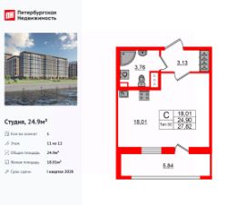 Продается просторная студия от застройщика в жилом комплексе ''Парадный ансамбль'' в престижном Московском районе.До метро можно добраться на транспорте всего за 20 минут.Удобная, классическая, функциональная европланировка, просторная прихожая 3.36 м². Общая площадь студии - 24.98 м², жилая 18.37 м², высота потолка 2.77 м.Квартира продается с отделкой ''Норд Лайн светлый''.Что особенного в ЖК ''Парадный ансамбль''?• Инновационный Лицей Setl с оригинальной архитектурной концепцией и уникальной образовательной средой• Масштабное малоэтажное строительство в престижном Московском районе• Рекреационные зоны: парадный парк в центре квартала, ручей с собственной набережной, центральная площадь, ресторанный комплекс и пешеходный бульвар• Фасады из керамогранита и кирпича с яркими и акцентными входными группами• Две самые большие площадки Setl Kids и Setl Sport• Уникальные квартиры.High Flat на последних этажах, палисадники у квартир на первом этаже, семейные секции, квартиры с саунами и окном в ванной