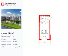Продается уютная студия от застройщика в жилом комплексе ''Парадный ансамбль'' в престижном Московском районе.До метро можно добраться на транспорте всего за 20 минут.Удобная, классическая, функциональная европланировка, вместительная прихожая 3.11 м². Общая площадь студии - 24.41 м², жилая 18.23 м², высота потолка 2.77 м.Квартира продается с отделкой ''Норд Лайн серый''.Что особенного в ЖК ''Парадный ансамбль''?• Инновационный Лицей Setl с оригинальной архитектурной концепцией и уникальной образовательной средой• Масштабное малоэтажное строительство в престижном Московском районе• Рекреационные зоны: парадный парк в центре квартала, ручей с собственной набережной, центральная площадь, ресторанный комплекс и пешеходный бульвар• Фасады из керамогранита и кирпича с яркими и акцентными входными группами• Две самые большие площадки Setl Kids и Setl Sport• Уникальные квартиры.High Flat на последних этажах, палисадники у квартир на первом этаже, семейные секции, квартиры с саунами и окном в ванной