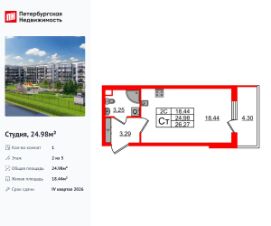Продается просторная студия от застройщика в жилом комплексе ''Парадный ансамбль'' в престижном Московском районе.До метро можно добраться на транспорте всего за 20 минут.Удобная, классическая, функциональная европланировка, просторная прихожая 3.29 м². Общая площадь студии - 24.98 м², жилая 18.44 м², высота потолка 2.77 м.Квартира продается с отделкой ''Норд Лайн серый''.Что особенного в ЖК ''Парадный ансамбль''?• Инновационный Лицей Setl с оригинальной архитектурной концепцией и уникальной образовательной средой• Масштабное малоэтажное строительство в престижном Московском районе• Рекреационные зоны: парадный парк в центре квартала, ручей с собственной набережной, центральная площадь, ресторанный комплекс и пешеходный бульвар• Фасады из керамогранита и кирпича с яркими и акцентными входными группами• Две самые большие площадки Setl Kids и Setl Sport• Уникальные квартиры.High Flat на последних этажах, палисадники у квартир на первом этаже, семейные секции, квартиры с саунами и окном в ванной