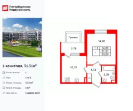 Продается уютная 1-комнатная квартира от застройщика в жилом комплексе ''Парадный ансамбль'' в престижном Московском районе.До метро можно добраться на транспорте всего за 20 минут.Удобная, классическая планировка, кухня 10.19 м², вместительная прихожая 3.73 м². Общая площадь квартиры - 31.31 м², жилая 14 м², высота потолка 2.77 м.Квартира продается с отделкой ''Норд Лайн светлый''.Что особенного в ЖК ''Парадный ансамбль''?• Инновационный Лицей Setl с оригинальной архитектурной концепцией и уникальной образовательной средой• Масштабное малоэтажное строительство в престижном Московском районе• Рекреационные зоны: парадный парк в центре квартала, ручей с собственной набережной, центральная площадь, ресторанный комплекс и пешеходный бульвар• Фасады из керамогранита и кирпича с яркими и акцентными входными группами• Две самые большие площадки Setl Kids и Setl Sport• Уникальные квартиры.High Flat на последних этажах, палисадники у квартир на первом этаже, семейные секции, квартиры с саунами и окном в ванной