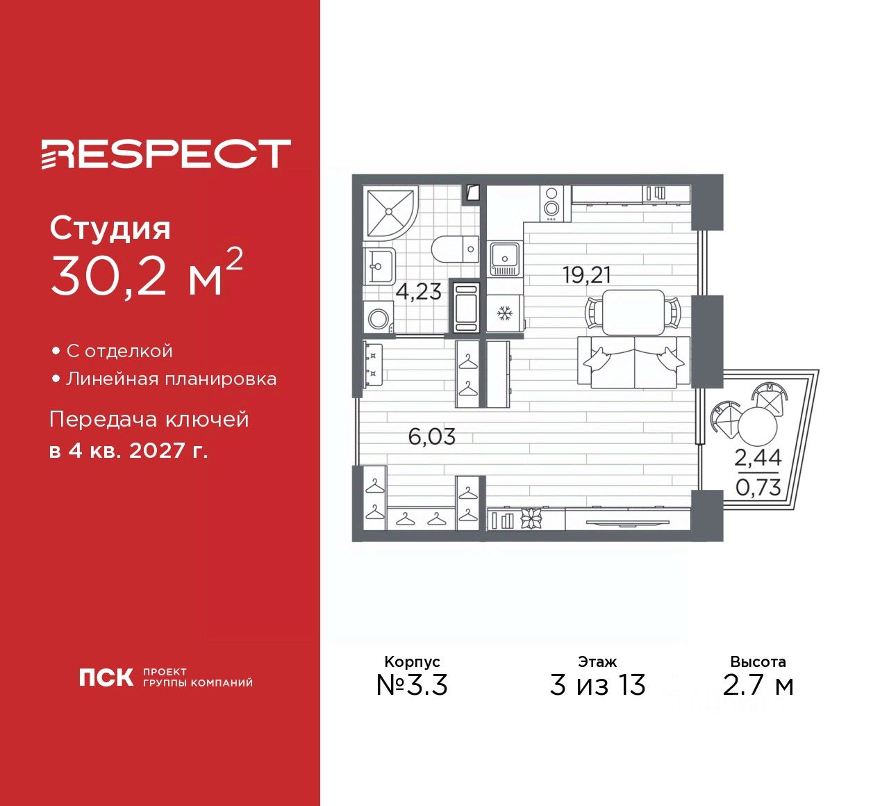 1-комн. квартира-студия с отделкой в ЖК ''RESPECT'' на 4 этаже. Общая площадь: 27.13 кв.м., площадь гостиной 17.56 кв.м., из которых 5 кв.м. выделено под кухонную зону. Все окна выходят на одну сторону. В квартире один балкон, один совмещенный санузел. Высота потолков 2.7 м. Дом монолитный, многоподъездный, переменной этажности, от 8 до 13 этажей. Квартира находится в 1-й секции высотой 13 этажей в корпусе 3.3. На этаже 6 квартир. В подъезде 1 пассажирский и 1 грузовой лифт. Начало строительства - 3 квартал 2025 года. Окончание строительства - 4 квартал 2027 года. Оформление сделки по договору долевого участия. В шаговой доступности от жилого комплекса имеются станции метро (расстояние по прямой): ''Лесная'' (800 м), ''Площадь Мужества'' (1.4 км), ''Выборгская'' (1.9 км), также недалеко от этого корпуса находятся станции метро: ''Академическая'', ''Политехническая''. Жилой квартал ''RESPECT'' строится на Полюстровском пр, 87, в одной из самых востребованных локаций Петербурга. В 10 минутах пешком - метро ''Лесная'' и в 10 минутах на транспорте - Петроградская сторона. Высота домов от 7 до 13 этажей. Квартиры сдаются с отделкой white box и с чистовой отделкой. На территории Respect строится школа на 1125 учащихся и детский сад на 240 мест. Запроектированы собственная газовая котельная, закрытая территория, дворы без машин и подземные паркинги с лифтами. В проекте предусмотрены трапециевидные балконы или остекленные лоджии, которые, с одной стороны, исключают монотонность фасада, являясь декоративными элементами, с другой дополнительным функциональным пространством в квартирах. Цветовая гармония фасадов каждого дома раскрывает характер квартала. Коричневый цвет клинкерного кирпича со структурой водяных штрихов — цвет уюта и безопасности, сдержанности и надёжности. Вентилируемые фасады облицованы клинкерным кирпичом. Его высокая прочность позволяет давать 100 лет гарантии на этот материал. Водопоглощение клинкерного кирпича составляет менее 5%, за счет чего у него высокая теплопроводность и прочность. В квартале запроектированы внутренние закрытые территории дворов домов без доступа автомобилей и безбарьерная среда для велосипедистов и колясок. Предусмотрены IP-домофония с функцией дистанционного открывания калиток и парадных, а также дистанционный сбор показаний счетчиков и мобильное приложение для жителей. Для безопасности жителей квартала - круглосуточное видеонаблюдение и служба охраны. В каждой квартире предусмотрены внешние корзины для кондиционеров. Вся территория квартала будет связана единой концепцией благоустройства, разработанной ландшафтным бюро L.BURO. На эксплуатируемой кровле на уровне первого этажа в домах 1 и 4 будут обустроены общественные видовые террасы. Это станет не только привлекательным местом с красивым видом, но и удобным, многофункциональным пространством. Дизайн парадных зон и входных групп - сочетание лаконичности отделки и декоративных элементов с текстурами из натурального камня и дерева с приглушенной подсвет