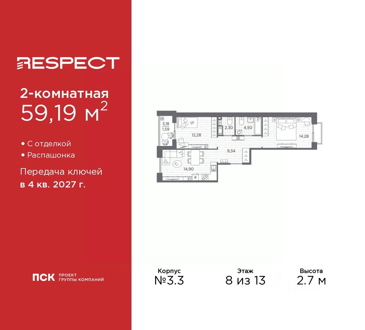 Продается 2-комн. квартира с отделкой в ЖК ''RESPECT'' на 8 этаже. Общая площадь: 59.19 кв.м., жилая: 26.56 кв.м., площадь просторной кухни-столовой: 14.9 кв.м. Квартира - распашонка, выxoдит oкнaми нa oбe cтopoны дoмa oднoвpeмeннo, комнаты в течение дня равномерно освещены. В квартире одна лоджия, один совмещенный и один раздельный санузел. Высота потолков 2.7 м. Дом монолитный, многоподъездный, переменной этажности, от 8 до 13 этажей. Квартира находится в 1-й секции высотой 13 этажей в корпусе 3.3. На этаже 6 квартир. В подъезде 1 пассажирский и 1 грузовой лифт. Начало строительства - 3 квартал 2025 года. Окончание строительства - 4 квартал 2027 года. Оформление сделки по договору долевого участия. В шаговой доступности от жилого комплекса расположены станции метро (расстояние по прямой): ''Лесная'' (800 м), ''Площадь Мужества'' (1.4 км), ''Выборгская'' (1.9 км), также недалеко от этого корпуса находятся станции метро: ''Академическая'', ''Политехническая''. Жилой квартал ''RESPECT'' строится на Полюстровском пр, 87, в одной из самых востребованных локаций Петербурга. В 10 минутах пешком - метро ''Лесная'' и в 10 минутах на транспорте - Петроградская сторона. Высота домов от 7 до 13 этажей. Квартиры сдаются с отделкой white box и с чистовой отделкой. На территории Respect строится школа на 1125 учащихся и детский сад на 240 мест. Запроектированы собственная газовая котельная, закрытая территория, дворы без машин и подземные паркинги с лифтами. В проекте предусмотрены трапециевидные балконы или остекленные лоджии, которые, с одной стороны, исключают монотонность фасада, являясь декоративными элементами, с другой дополнительным функциональным пространством в квартирах. Цветовая гармония фасадов каждого дома раскрывает характер квартала. Коричневый цвет клинкерного кирпича со структурой водяных штрихов — цвет уюта и безопасности, сдержанности и надёжности. Вентилируемые фасады облицованы клинкерным кирпичом. Его высокая прочность позволяет давать 100 лет гарантии на этот материал. Водопоглощение клинкерного кирпича составляет менее 5%, за счет чего у него высокая теплопроводность и прочность. В квартале запроектированы внутренние закрытые территории дворов домов без доступа автомобилей и безбарьерная среда для велосипедистов и колясок. Предусмотрены IP-домофония с функцией дистанционного открывания калиток и парадных, а также дистанционный сбор показаний счетчиков и мобильное приложение для жителей. Для безопасности жителей квартала - круглосуточное видеонаблюдение и служба охраны. В каждой квартире предусмотрены внешние корзины для кондиционеров. Вся территория квартала будет связана единой концепцией благоустройства, разработанной ландшафтным бюро L.BURO. На эксплуатируемой кровле на уровне первого этажа в домах 1 и 4 будут обустроены общественные видовые террасы. Это станет не только привлекательным местом с красивым видом, но и удобным, многофункциональным пространством. Дизайн парадных зон и входных групп - сочетание лаконичности отде