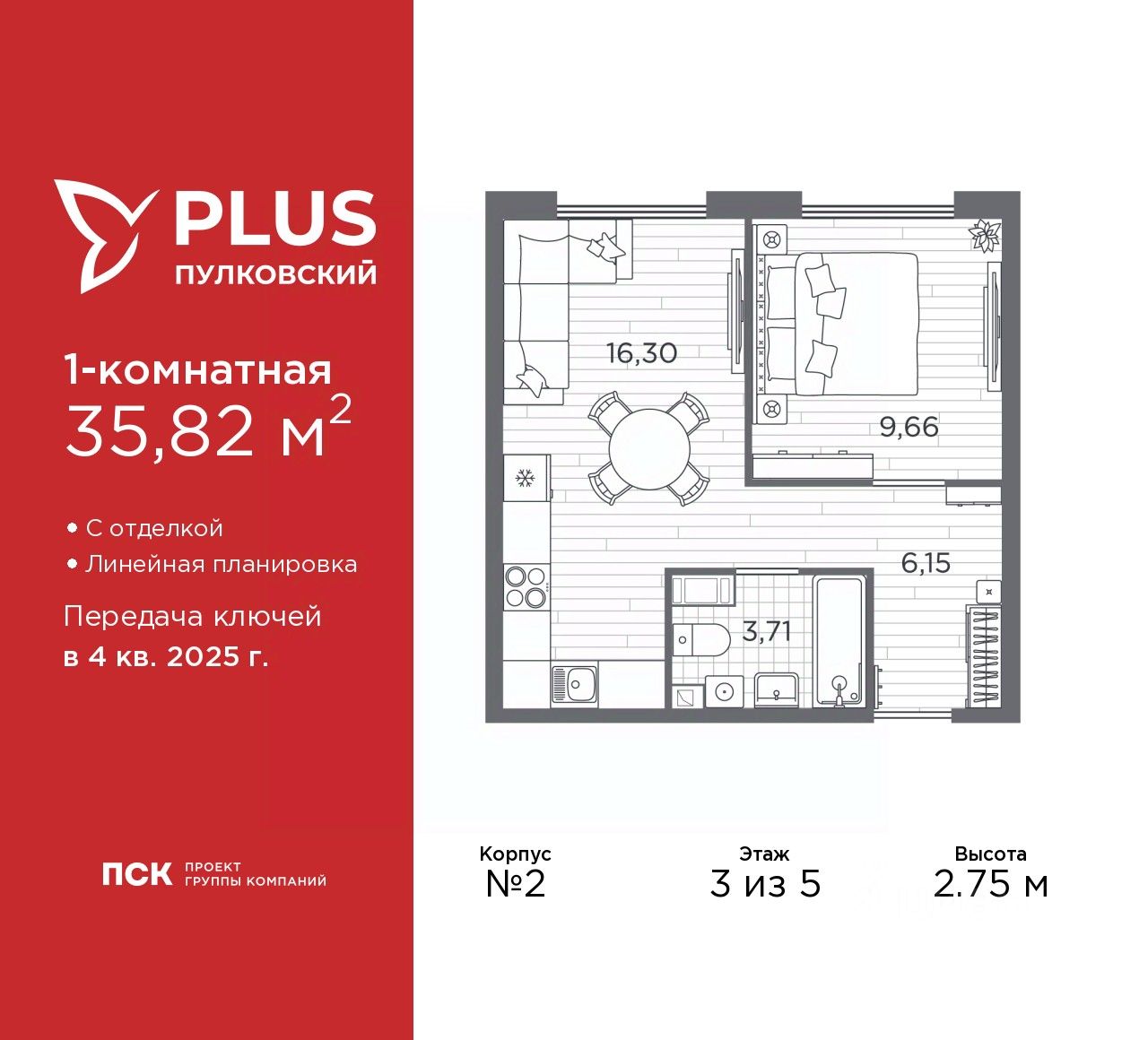 Однокомнатная квартира с отделкой в ЖК ''PLUS Пулковский'' на 3 этаже. Общая площадь: 35.82 кв.м., жилая: 9.66 кв.м., площадь просторной кухни-столовой: 16.3 кв.м. Все окна выходят на одну сторону. В квартире один совмещенный санузел. Высота потолков 2.75 м. Дом монолитный, многоподъездный, высотой 5 этажей. Квартира находится в 5-й секции в корпусе 2. На этаже 7 квартир. В подъезде 1 грузовой лифт. Начало строительства - 4 квартал 2023 года. Окончание строительства - 4 квартал 2025 года. Оформление сделки по договору долевого участия. Уютный пятиэтажный city квартал PLUS Пулковский расположен в престижном Московском районе на пересечении Пулковского и Волхонского шоссе в новом формирующемся микрорайоне. Рядом проходит одна из важнейших транспортных артерий города Пулковское шоссе, а в 10 минутах езды два въезда на КАД и въезд на ЗСД. Благодаря удобному и быстрому выезду на Пулковское шоссе, можно легко добраться до центра города за 35 мин. До станций метро ''Московская'' и ''Купчино'' - 15 мин. на машине, а до аэропорта Пулково - 17 мин. В составе квартала: 30 пятиэтажных домов, школа со спортивным стадионом, 2 детских сада с бассейнами, наземные и подземные паркинги, центральный зеленый бульвар с play hub и местами отдыха. Благоустройство квартала продумано до мельчайших деталей, в его основе - забота о качестве жизни каждого жителя. Дома возводятся по современной монолитной технологии строительства с вентилируемыми фасадами. Благодаря большим увеличенным окнам и отсутствию высокоэтажных домов, во всех квартирах максимальный объем естественного света. В составе квартала запланированы социально-значимые объекты: школа на 825 мест со спортивным стадионом и бассейнами, два детских сада с бассейнами на 220 мест каждый. Территория квартала зонирована таким образом, чтобы автомобильные и пешеходные потоки и не пересекались. Прогулочные и велосипедные дорожки отделены от автомобильных проездов зелеными насаждениями. Дворы закрыты для машин, что дает чувство дополнительной безопасности для жителей особенно, для самых маленьких. Вся территория квартала безбарьерная. Здесь нет пандусов, резких перепадов высот или неудобных ступеней. Вход в парадные с уровня земли. В каждом дворе есть своя оборудованная детская площадка. А в центре микрорайона расположится большая игровая площадка play hub с пространством для командных игр. PLUS Пулковский располагается в молодом микрорайоне, который сейчас находится в стадии активного развития. Он будет обладать собственной развитой инфраструктурой. В радиусе 15 минут езды на автомобиле располагаются многочисленные магазины, супермаркеты, спортивные, образовательные и медицинские учреждения, парки и достопримечательности. Для автомашин предусмотрены отдельно стоящий 5-ти этажный паркинг на 958 машино-мест, две подземные парковки на 367 машино-мест и наземные парковочные зоны по внешнему периметру микрорайона. #26Bt8a