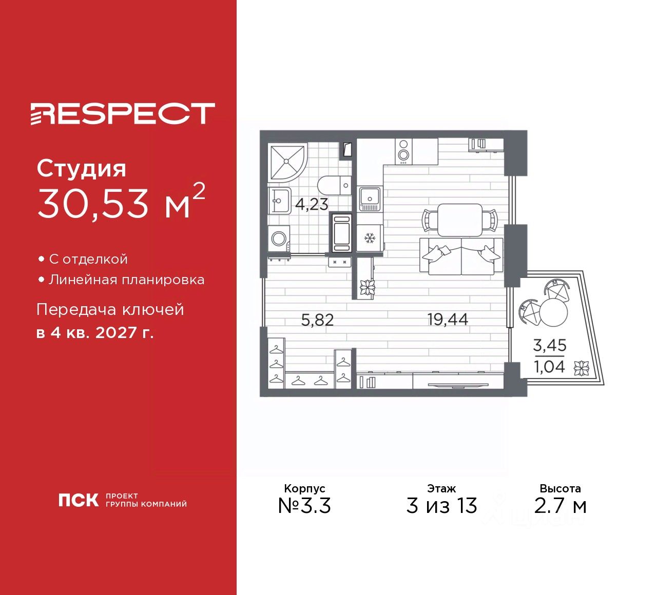 1-комн. квартира-студия с отделкой в ЖК ''RESPECT'' на 3 этаже. Общая площадь: 30.53 кв.м., площадь гостиной 19.44 кв.м., из которых 5 кв.м. выделено под кухонную зону. Все окна выходят на одну сторону. В квартире один балкон, один совмещенный санузел. Высота потолков 2.7 м. Дом монолитный, многоподъездный, переменной этажности, от 8 до 13 этажей. Квартира находится в 1-й секции высотой 13 этажей в корпусе 3.3. На этаже 6 квартир. В подъезде 1 пассажирский и 1 грузовой лифт. Начало строительства - 3 квартал 2025 года. Окончание строительства - 4 квартал 2027 года. Оформление сделки по договору долевого участия. В шаговой доступности от жилого комплекса расположены станции метро (расстояние по прямой): ''Лесная'' (800 м), ''Площадь Мужества'' (1.4 км), ''Выборгская'' (1.9 км), также недалеко от этого корпуса находятся станции метро: ''Академическая'', ''Политехническая''. Квартал строится на Полюстровском пр, 87, в одной из самых востребованных локаций Петербурга. В 10 минутах пешком - метро ''Лесная'' и в 10 минутах на транспорте - Петроградская сторона. Высота домов от 7 до 13 этажей. На территории Respect строится школа на 1125 учащихся и детский сад на 240 мест. Запроектированы собственная газовая котельная, закрытая территория, дворы без машин и подземные паркинги с лифтами. Вентилируемые фасады облицованы клинкерным кирпичом. Дома из этого материала служат веками, являясь гордостью хозяев. Дизайн парадных зон и входных групп - сочетание лаконичности отделки и декоративных элементов с текстурами из натурального камня и дерева с приглушенной подсветкой теплым светом. Во входных группах расположены гостевые зоны с мягкой мебелью. Вся территория квартала будет связана единой концепцией благоустройства, разработанной ландшафтным бюро L.BURO. В основе - идея создания увлекательного ландшафтного пространства для насыщенной жизни, включающего в себя пейзажные зоны, современные архитектурные композиции, открытые террасы на стилобатах с зонами отдыха и парклетами, спортивными площадками. Это пространство для людей всех возрастов и различных увлечений. На эксплуатируемой кровле на уровне первого этажа в домах 1 и 4 будут обустроены общественные видовые террасы. В квартале запроектированы внутренние закрытые территории дворов домов без доступа автомобилей и безбарьерная среда для велосипедистов и колясок. Предусмотрены IP-домофония с функцией дистанционного открывания калиток и парадных, а также дистанционный сбор показаний счетчиков и мобильное приложение для жителей. Для безопасности жителей квартала - круглосуточное видеонаблюдение и служба охраны. В каждой квартире предусмотрены внешние корзины для кондиционеров. #z6bbcE