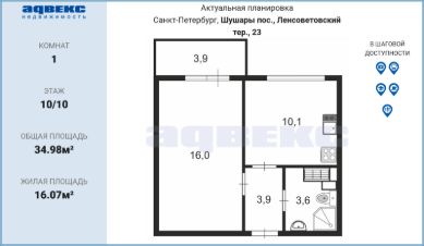 ID: 1905774Однокомнатная, видовая, площадью 33, 81 кв.м. расположена в 30 минутах езды на транспорте от станции метро ''Купчино'', в 10 минутах пешком от остановки общественного транспорта, на 10 этаже 10 этажного дома.