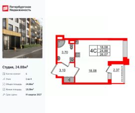 Продается просторная студия от застройщика в жилом комплексе ''Парадный ансамбль'' в престижном Московском районе.До метро можно добраться на транспорте всего за 20 минут.Уникальная, функциональная европланировка, просторная прихожая 3.26 м². Общая площадь студии - 25 м², жилая 18.27 м², высота потолка 2.77 м.Квартира продается с отделкой ''NORD LINE WHITE''.Что особенного в ЖК ''Парадный ансамбль''?• Инновационный Лицей Setl с оригинальной архитектурной концепцией и уникальной образовательной средой• Масштабное малоэтажное строительство в престижном Московском районе• Рекреационные зоны: парадный парк в центре квартала, ручей с собственной набережной, центральная площадь, ресторанный комплекс и пешеходный бульвар• Фасады из керамогранита и кирпича с яркими и акцентными входными группами• Две самые большие площадки Setl Kids и Setl Sport• Уникальные квартиры.High Flat на последних этажах, палисадники у квартир на первом этаже, семейные секции, квартиры с саунами и окном в ванной