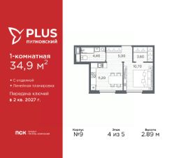 Просторная 1-комн. квартира с отделкой в ЖК ''PLUS Пулковский'' на 4 этаже. Общая площадь: 34.9 кв.м., жилая: 10.7 кв.м., площадь просторной кухни-столовой: 11.2 кв.м. Все окна выходят на одну сторону. В квартире один совмещенный санузел. Высота потолков 2.89 м. Дом монолитный, трехподъездный, высотой 5 этажей. Квартира находится во 2-й секции в корпусе 9. На этаже 6 квартир. В подъезде 1 грузовой лифт. Окончание строительства - 2 квартал 2027 года. Оформление сделки по договору долевого участия. ЖК ''PLUS Пулковский'' расположен в престижном Московском районе на пересечении Пулковского и Волхонского шоссе, по которым можно быстро добраться до КАД и до станций метро Московская и Звёздная. Поблизости расположены дворцово-парковые ансамбли Пушкина, Павловска, Петергофа, Гатчины, Ломоносова, а также вся торговая и развлекательная инфраструктура: ТК Лето, Outlet Village Pulkovo, Пулково-3, гипермаркеты Лента, Окей, Metro. На территории комплекса будут построены средняя образовательная школа на 825 мест с двумя бассейнами, 2 детских сада на 220 мест каждый. В детских садах тоже будут бассейны. Кроме этого будет построен медицинский центр для взрослых и детей. Во дворах буду оборудованы спортивные и безопасные детские площадки, на первых этажах домов будут расположены коммерческие помещения. Для автолюбителей будут подземные и наземный паркинги. Для жителей домов будет доступно ''приложение жителя'', которое предоставит такие возможности:— дистанционное открытие дверей в парадную и на территорию комплекса,— просмотр изображений с видеокамер,— контроль за показаниями счетчиков,— коммуникация с УК.Показания всех счетчиков будут собираться дистанционно.В квартирах будет выполнена коллекторная разводка отопления в стяжке пола от коллекторов в межквартирных коридорах. Застройщик ЖК ''PLUS Пулковский'' - группа компаний ПСК, которая является одной из ведущих девелоперских компаний Санкт Петербурга. Более 16 лет она возводит в Северной столице качественное жилье премиум, бизнес и комфорт-класса, социальные объекты школы и детские сады, апарт-комплексы и торговые центры и является четырехкратным обладателем золотого знака ''Надежный застройщик России''. #26Btze