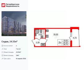 Продается просторная студия от застройщика в жилом комплексе ''Бионика Заповедная'' в динамичном Приморском районе.До метро можно добраться на транспорте всего за 11 минут.Удобная, классическая, функциональная европланировка, просторная прихожая 3.7 м². Общая площадь студии - 25.7 м², жилая 18 м², высота потолка 2.77 м.Квартира продается с отделкой ''NORD LINE WHITE ВК NEW''.Что особенного в ЖК ''Бионика Заповедная''?• Оазис в городе 3 минуты пешком до Новоорловского заказника (140 ГА)• Захватывающие виды из окон на хвойный лесопарк• Всесезонный ''Заповедный парк'' во дворе площадью 23000 кв.м.• 5 единых входных групп с авторским дизайном и лаундж-зонами, сити-виллы на первых этажах с палисадниками и высотой потолков до 4 м• Места притяжения: фонтан ''Бионика'', спортивный кластер со скейт-парком, фотозоны с арт-объектами