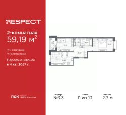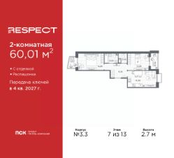 2-комн. квартира с отделкой в ЖК ''RESPECT'' на 11 этаже. Общая площадь: 58.04 кв.м., жилая: 23.34 кв.м., площадь просторной кухни-столовой: 13.88 кв.м. Квартира - распашонка, без проходных комнат, окна выходят на paзные стороны дома. В квартире два балкона, один совмещенный и один раздельный санузел. Высота потолков 2.7 м. Дом монолитный, многоподъездный, переменной этажности, от 8 до 13 этажей. Квартира находится в 1-й секции высотой 13 этажей в корпусе 3.3. На этаже 6 квартир. В подъезде 1 пассажирский и 1 грузовой лифт. Начало строительства - 3 квартал 2025 года. Окончание строительства - 4 квартал 2027 года. Оформление сделки по договору долевого участия. В шаговой доступности от жилого комплекса находятся станции метро (расстояние по прямой): ''Лесная'' (800 м), ''Площадь Мужества'' (1.4 км), ''Выборгская'' (1.9 км), также недалеко от этого корпуса расположены станции метро: ''Академическая'', ''Политехническая''. Жилой квартал ''RESPECT'' строится на Полюстровском пр, 87, в одной из самых востребованных локаций Петербурга. В 10 минутах пешком - метро ''Лесная'' и в 10 минутах на транспорте - Петроградская сторона. Высота домов от 7 до 13 этажей. Квартиры сдаются с отделкой white box и с чистовой отделкой. На территории Respect строится школа на 1125 учащихся и детский сад на 240 мест. Запроектированы собственная газовая котельная, закрытая территория, дворы без машин и подземные паркинги с лифтами.В проекте предусмотрены трапециевидные балконы или остекленные лоджии, которые, с одной стороны, исключают монотонность фасада, являясь декоративными элементами, с другой дополнительным функциональным пространством в квартирах. Цветовая гармония фасадов каждого дома раскрывает характер квартала. Коричневый цвет клинкерного кирпича со структурой водяных штрихов — цвет уюта и безопасности, сдержанности и надёжности. Вентилируемые фасады облицованы клинкерным кирпичом. Его высокая прочность позволяет давать 100 лет гарантии на этот материал. Водопоглощение клинкерного кирпича составляет менее 5%, за счет чего у него высокая теплопроводность и прочность. В квартале запроектированы внутренние закрытые территории дворов домов без доступа автомобилей и безбарьерная среда для велосипедистов и колясок. Предусмотрены IP-домофония с функцией дистанционного открывания калиток и парадных, а также дистанционный сбор показаний счетчиков и мобильное приложение для жителей. Для безопасности жителей квартала - круглосуточное видеонаблюдение и служба охраны. В каждой квартире предусмотрены внешние корзины для кондиционеров. Вся территория квартала будет связана единой концепцией благоустройства, разработанной ландшафтным бюро L.BURO. На эксплуатируемой кровле на уровне первого этажа в домах 1 и 4 будут обустроены общественные видовые террасы. Это станет не только привлекательным местом с красивым видом, но и удобным, многофункциональным пространством. Дизайн парадных зон и входных групп - сочетание лаконичности отделки и декоративных элементов с текстурами
