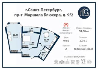 Код объекта: 1940036.Однокомнатная квартира по проспекту Блюхера 9к1Продаётся однокомнатная квартира (можно сказать двухкомнатная) площадью 43,2 кв. м на 15 этаже 16-этажного дома по адресу: Санкт-Петербург, проспект Маршала Блюхера, 9к1, ЖК комфорт класса ''Фламинго'', окна во двор.Квартира расположена в удобной локации, район с развитой инфраструктурой: рядом есть всё необходимое для комфортной жизни — магазины (''Пятерочка'', ''Магнит'', ''Лента'', ''Перекресток''), 2 школы, 3 детских садика, поликлиники и спортивные клубы, въезд на КАД - 7-10 минут. Близость к общественному транспорту позволяет быстро добраться до любой точки города, до метро Лесная 20 минут, напротив дома остановка общественного транспорта, до центра города 15 минут на машине.Удобная планировка и ремонт комфорт класса: жилая площадь составляет 27,5 кв. м, кухня — 9,8 кв. м. Высокие потолки (3 м) создают ощущение простора. Евроремонт позволяет сразу заселиться, дополнительных вложений не требуется.Дом построен в 2017 году из монолитного материала, что гарантирует его надёжность и долговечность. Подземная парковка обеспечит безопасность вашего автомобиля.Эта квартира также может быть интересным вариантом для инвесторов: выгодное расположение и современная планировка делают её ликвидной и перспективной для сдачи в аренду или перепродажи.Мы гарантируем безопасную сделку и юридическую поддержку нашим Клиентам. Поможем одобрить ипотеку с сниженной ставкой.