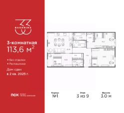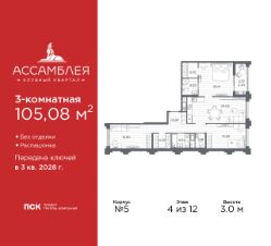 Продается трехкомнатная квартира в Клубный квартал ''Ассамблея'' на 9 этаже. Квартира без отделки, новый владелец может сделать ремонт по своему дизайн-проекту. Общая площадь: 88.11 кв.м., жилая: 38.74 кв.м., площадь просторной кухни-столовой: 21.92 кв.м. Квартира - распашонка, без проходных комнат, окна выходят на paзные стороны дома. В квартире одна лоджия, два совмещенных и один раздельный санузел. Высота потолков 3.0 м. Дом монолитный, черырехподъездный, высотой 12 этажей. Квартира находится во 2-й секции в корпусе 5. На этаже 8 квартир. В подъезде 1 пассажирский и 1 грузовой лифт. Окончание строительства - 3 квартал 2028 года. Оформление сделки по договору долевого участия. В шаговой доступности от жилого комплекса расположены станции метро (расстояние по прямой): ''Горный институт'' (1.0 км), ''Василеостровская'' (1.4 км), ''Приморская'' (1.5 км), также недалеко от этого корпуса расположены станции метро: ''Спортивная'', ''Чкаловская''. ''Клубный квартал Ассамблея'' — проект бизнес-класса на Васильевском острове, в самом сердце исторического Петербурга. Комплекс состоит из пяти корпусов переменной этажности — от 7 до 12 этажей — с выразительной архитектурой в стиле неомодернизма: светлый клинкер, панорамное остекление, просторное лобби с потолками высотой почти 8 метров. Потолки — до 3,2 метров. Подземный паркинг на 667 машиномест. Комфорт и инфраструктура Проект ориентирован на комфортную городскую жизнь. В закрытом дворе — ландшафтное озеленение, современные детские и спортивные площадки. Внутренний клуб для резидентов включает коворкинг, переговорные, кинозал, фитнес и бьюти-зону. IP-домофония с просмотром камер видеонаблюдения, дистанционное открывание дверей и доступа на территорию и в парадную со смартфона и планшета, просмотр показаний счетчиков, приложение для жителей PSK Home. Локация Расположение на Васильевском острове — сильная сторона проекта. До четырех станций метро (''Горный институт'', ''Василеостровская'', ''Спортивная'', ''Приморская'') — 515 минут пешком. В шаговой доступности — зелёные зоны, культурные учреждения, в том числе сад ''Василеостровец'' и ДК имени Кирова. Основные магистрали Большой, Средний и Малый проспекты, Наличная и Уральская улицы. Съезд на ЗСД расположен недалеко от станции метро ''Приморская'', близ береговой линии. Благовещенский и Дворцовый мосты соединяют остров с центром города, а мосты Тучков, Биржевой и Бетанкура — с Петроградской стороной. Застройщик Группа компаний ПСК является одной из ведущих девелоперских компаний Санкт Петербурга. На протяжении 18 лет она возводит в Северной столице качественное жилье премиум, бизнес и комфорт-класса, социальные объекты школы и детские сады, апарт-отели и торговые центры. Является шестикратным обладателем золотого знака ''Надежный застройщик России''. #Z6zgCU