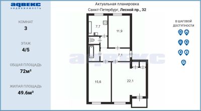 Продается интересная трехкомнатная квартира в новом доме. Квартира с полной отделкой: - покрытие пола в жилых комнатах: ламинат 32 класса, - покрытие пола на кухне и в прихожей: керамическая плитка, - стены туалета и ванной: керамическая плитка, - сантехника в туалете и ванной, - счетчики на ХВС и ГВС, - коллекторная система отопления с установкой счетчиков. Экологически чистый, перспективный и развитой район Санкт-Петербурга рядом с метро: до станции метро ''Проспект Просвещения'' 18 минут пешком. Рядом расположены ТРК и круглосуточный физкультурно-оздоровительный комплекс (фитнес-клуб). Для автовладельцев предусмотрен охраняемый паркинг. Во внутреннем дворе находятся безопасные детские площадки, зона отдыха и променада. На первых этажах комплекса предусмотрены коммерческие помещения под магазины и услуги. Просмотры в удобное для Вас время. ID Объекта: V1083