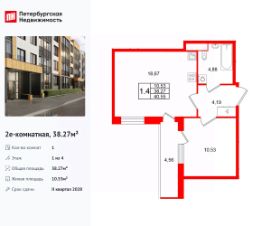 Продается просторная 1-комнатная квартира от застройщика в жилом комплексе ''Univer City'' в на юге Санкт-Петербурга.До метро можно добраться на транспорте всего за 30 минут.Удобная, классическая, функциональная европланировка, большая кухня-гостиная 18.67 м², просторная прихожая 4.19 м². Общая площадь квартиры - 38.27 м², жилая 10.53 м², высота потолка 2.77 м.Квартира продается с отделкой ''Норд Лайн светлый''.Что особенного в ЖК ''Univer City''?• Малоэтажное строительство• Скандинавские фасады с отделкой керамогранитом, акцентные входные группы• Закрытые внутренние дворы без машин• Пешеходный променад с тематическими зонами, еловый сквер и яблоневый сад• Univer Park, включая SetlSport и SetlKids, площадку для выгула собак и зоны отдыха• Инновационный Лицей Setl с оригинальной архитектурной концепцией и уникальной образовательной средой