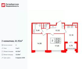 Продается просторная 2-комнатная квартира от застройщика в жилом комплексе ''Кристалл Холл'' в Адмиралтейском районе.До метро можно добраться Тип 1 всего за 15 минут.Удобная, классическая планировка, кухня 12.19 м², просторная прихожая 10.52 м². Общая площадь квартиры - 61.92 м², жилая 32.03 м², высота потолка 3 м.Квартира продается c черновой отделкой.