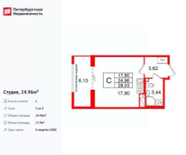 Продается просторная студия от застройщика в жилом комплексе ''Кристалл Холл'' в Адмиралтейском районе.До метро можно добраться Тип 1 всего за 15 минут.Удобная, классическая, функциональная европланировка, просторная прихожая 3.62 м². Общая площадь студии - 24.96 м², жилая 17.9 м², высота потолка 3 м.Квартира продается с отделкой ''NORD LINE BUSINESS''.