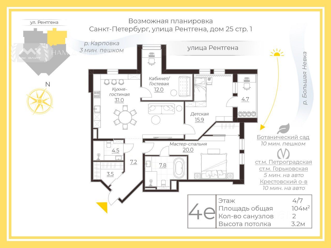 Арт. 128811776 Жилой дом White House торжество архитектурных решений и комфорта. Здесь в продаже редкий лот - трехкомнатная квартира. Планировка включает: -кухня-гостиная может быть площадью до 40 м. -2-3 спальни -гардеробная -ванная -гостевой с/у -балкон -холл В квартире большое количество панорамных окон ''в пол'', это северо-восточная сторона, солнце в первой половине дня. Квартира угловая, имеет красивый обзор в сторону Большой Невки и Гренадерского моста. Интересная планировка позволит дизайнеру воплотить все ваши пожелания по эргономике. В презентации предложены разные варианты планировочных решений. Высокие потолки - 3.20м. Камерный новый дом в тихой части Петроградского острова. Рядом Ботанический сад, новое общественное пространство для отдыха - набережная Карповки, а так же широкая набережная Большой Невки для пеших и велопрогулок. До Крейсера Авроры и Парадной Невы - буквально 15 минут пешком. Станция метро Петроградская в 10 минутах шаговой доступности. Лучшие образовательные учреждения и вся необходимая инфраструктура - под рукой. Дом находится под круглосуточным видеонаблюдением и охраной. Закрытый двор, консьерж-сервис. Автоматизированный подземный паркинг. Лобби украшает красивый атриум с прозрачным куполом и панорамным лифтом. В стоимость включено кладовое помещение. Более подробно - при встрече, звоните!