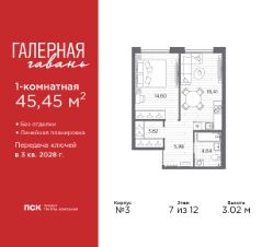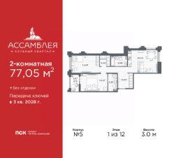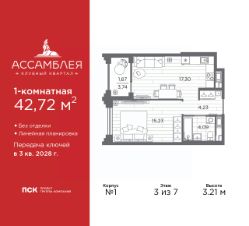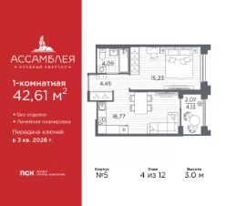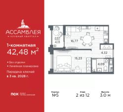 Продается однокомнатная квартира в Клубный квартал ''Ассамблея'' на 2 этаже. Квартира без отделки, новый владелец может сделать ремонт по своему дизайн-проекту. Общая площадь: 42.48 кв.м., жилая: 15.23 кв.м., площадь просторной кухни-столовой: 16.77 кв.м. Все окна выходят на одну сторону. В квартире одна лоджия, один совмещенный санузел. Высота потолков 3.0 м. Дом монолитный, черырехподъездный, высотой 12 этажей. Квартира находится в 1-й секции в корпусе 5. На этаже 6 квартир. В подъезде 1 пассажирский и 1 грузовой лифт. Окончание строительства - 3 квартал 2028 года. Оформление сделки по договору долевого участия. В шаговой доступности от жилого комплекса находятся станции метро (расстояние по прямой): ''Горный институт'' (1.0 км), ''Василеостровская'' (1.4 км), ''Приморская'' (1.5 км), также недалеко от этого корпуса расположены станции метро: ''Спортивная'', ''Чкаловская''. ''Клубный квартал Ассамблея'' — проект бизнес-класса на Васильевском острове, в самом сердце исторического Петербурга. Комплекс состоит из пяти корпусов переменной этажности — от 7 до 12 этажей — с выразительной архитектурой в стиле неомодернизма: светлый клинкер, панорамное остекление, просторное лобби с потолками высотой почти 8 метров. Потолки — до 3,2 метров. Подземный паркинг на 667 машиномест. Комфорт и инфраструктура Проект ориентирован на комфортную городскую жизнь. В закрытом дворе — ландшафтное озеленение, современные детские и спортивные площадки. Внутренний клуб для резидентов включает коворкинг, переговорные, кинозал, фитнес и бьюти-зону. IP-домофония с просмотром камер видеонаблюдения, дистанционное открывание дверей и доступа на территорию и в парадную со смартфона и планшета, просмотр показаний счетчиков, приложение для жителей PSK Home. Локация Расположение на Васильевском острове — сильная сторона проекта. До четырех станций метро (''Горный институт'', ''Василеостровская'', ''Спортивная'', ''Приморская'') — 515 минут пешком. В шаговой доступности — зелёные зоны, культурные учреждения, в том числе сад ''Василеостровец'' и ДК имени Кирова. Основные магистрали Большой, Средний и Малый проспекты, Наличная и Уральская улицы. Съезд на ЗСД расположен недалеко от станции метро ''Приморская'', близ береговой линии. Благовещенский и Дворцовый мосты соединяют остров с центром города, а мосты Тучков, Биржевой и Бетанкура — с Петроградской стороной. Застройщик Группа компаний ПСК является одной из ведущих девелоперских компаний Санкт Петербурга. На протяжении 18 лет она возводит в Северной столице качественное жилье премиум, бизнес и комфорт-класса, социальные объекты школы и детские сады, апарт-отели и торговые центры. Является шестикратным обладателем золотого знака ''Надежный застройщик России''. #2MbgMd