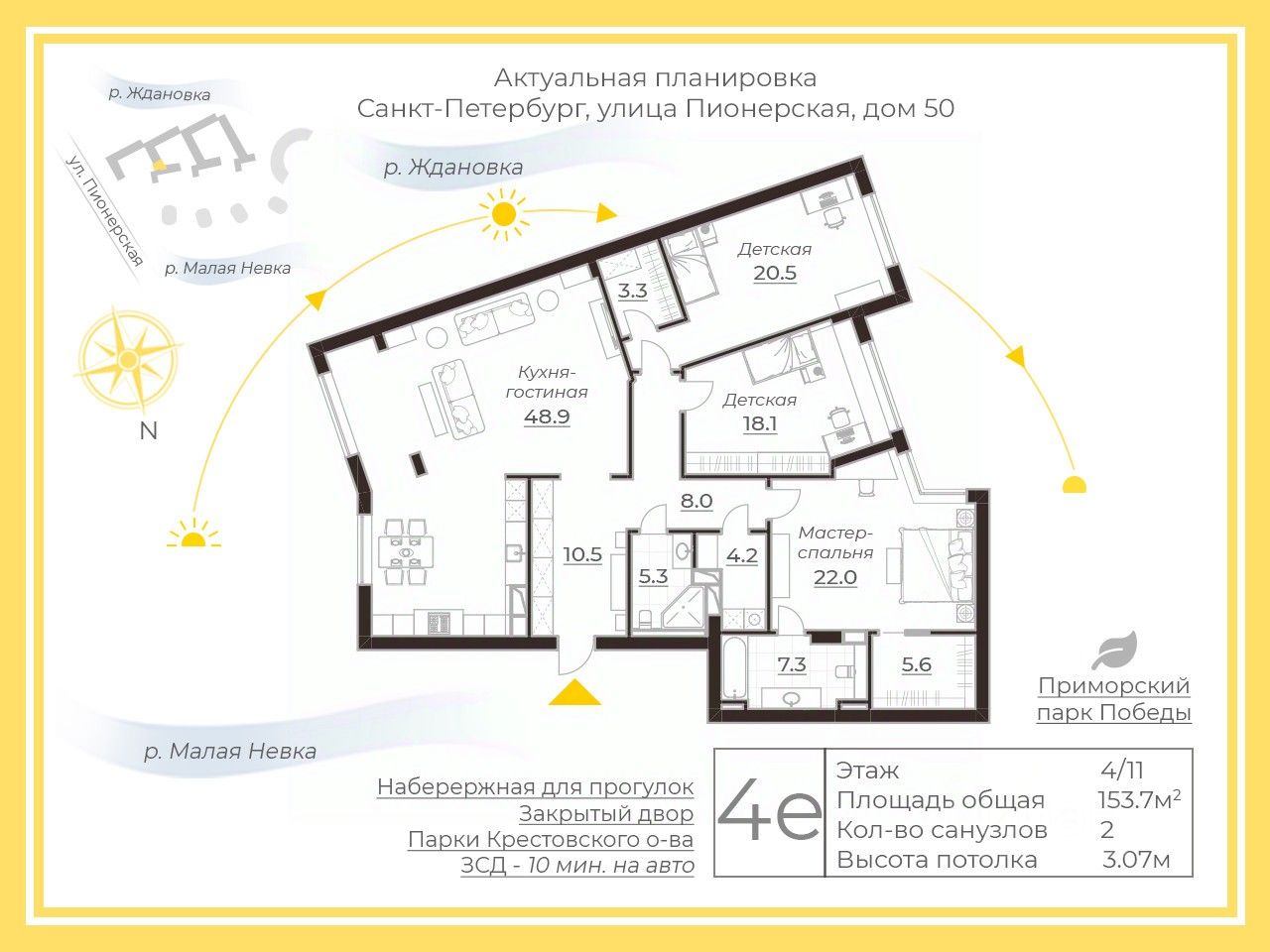 Арт. 123639921 Семейная квартира с видом на воду! Предлагается к покупке видовая семейная квартира с идеальной организацией пространства. Квартира расположена на 6/8 этаже в ЖК The One от застройщика Setl City (2022 г.п.) Динамичный и развитый район со всей необходимой инфраструктурой: в десяти минутах пешком расположены парки Крестовского и Елагина островов, до центра города или выезда на ЗСД пять минут на машине. В шаговой доступности дет сады и новая школа. Вдоль Петровского проспекта на первых этажах расположены рестораны, магазины, пекарни и тд. Дом расположен на закрытой придомовой территории. Пешеходная аллея ведет к благоустроенной пешеходной набережной, на которую предусмотрен приватный выход (можно гулять с собакой). Детские площадки для разных возрастов находятся внутри закрытого двора, куда можно попасть только через центральную входную группу. Очень много газонов с кустарниками и цветниками, валунами и множеством других растений. В квартире организована правильная и удобная планировка: общая площадь 129.6 кв.м. Кухня-гостиная, 3 изолированные комнаты (две детские и родительская мастер-спальня с двумя гардеробами), прихожая с гардеробом и бытовая комната. Большая часть окон квартиры (кроме мастер-спальни) выходят в сторону Малой Невки. В квартире сделан высококачественный ремонт по авторскому проекту с использованием натуральных материалов и современных технических решений: максимальная звукоизоляция во всех помещениях, фильтры на воду, система против протечек воды и умный дом, система кондиционирования и принудительная приточно-вытяжная вентиляция с фильтрацией воздуха. В отделке использована венецианская штукатурка, натуральный шпон американского ореха и мрамор. Вся встроенная мебель изготовлена на заказ, поэтому предусмотрено много дополнительных мест хранения. Бытовая техника, сантехника и осветительные приборы соответствуют уровню произведенного ремонта. Высота потолков 3 метра. Есть возможность приобретения парковочных мест в подземном паркинге. Прямая продажа, один собственник, быстрый выход на сделку. Чтобы уточнить условия или посмотреть квартиру - звоните сегодня!