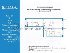 128654532 Продаётся уютная двухкомнатная квартира площадью 44.5 квадратных метров на четвёртом этаже пятиэтажного панельного дома, расположенного в спокойном районе поселка Гончарово. Рассмотрим варианты обмена на город Выборг.Жилая площадь составляет 31.5 квадратных метров, комнаты раздельные (17,4 и 14.1 м2), что предоставляет достаточно места для комфортного размещения мебели и создания индивидуального интерьера. Кухня площадью 5.4 квадратных метров позволит вам с комфортом готовить и проводить время за чашкой утреннего кофе. Наличие раздельного санузла добавляет дополнительное удобство для семейного использования.Из окон квартиры открывается приятный вид на двор, где расположены детская и спортивная площадки идеальное место для отдыха и занятий спортом на свежем воздухе. Для автовладельцев предусмотрена парковка во дворе.Состояние квартиры жилое, чистое. Установлены стекло пакеты. Также имеется балкон, который можно обустроить под зону отдыха или небольшой зелёный уголок.Посёлок с развитой социальной инфраструктурой: рядом находятся детский сад ''Рябинушка'' и школа ''Гончаровская'', а также супермаркет ''Магнит'', 4 магазина, медсанчасть, библиотека, Почта России, Оzоn, 4 детские площадки, игровые поля что делает расположение особенно удобным для семей с детьми.До Выборга 15 минут езды на машине и 25 минут на регулярном автобусе. До Выборга 15 км, до Санкт-Петербурга 120 км. Две остановки возле дома. Живописное место, река Перовка и леса.Этот вариант станет отличным выбором для тех, кто ценит тишину, уединённость и при этом имеет возможность наслаждаться всеми преимуществами благоустроенного жилья.Звоните , заранее записывайтесь на просмотр.Итака. Работаем с 1993 года.Итака. Работаем с 1993 года.Итака. Работаем с 1993 года.