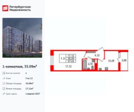 Продается просторная 1-комнатная квартира от застройщика в жилом комплексе ''Бионика Заповедная'' в динамичном Приморском районе.До метро можно добраться на транспорте всего за 11 минут.Удобная, классическая планировка, кухня 10.09 м², просторная прихожая 4.12 м². Общая площадь квартиры - 35.09 м², жилая 17.12 м², высота потолка 2.77 м.Квартира продается с отделкой ''Норд Лайн светлый плюс''.Что особенного в ЖК ''Бионика Заповедная''?• Оазис в городе 3 минуты пешком до Новоорловского заказника (140 ГА)• Захватывающие виды из окон на хвойный лесопарк• Всесезонный ''Заповедный парк'' во дворе площадью 23000 кв.м.• 5 единых входных групп с авторским дизайном и лаундж-зонами, сити-виллы на первых этажах с палисадниками и высотой потолков до 4 м• Места притяжения: фонтан ''Бионика'', спортивный кластер со скейт-парком, фотозоны с арт-объектами
