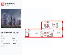 Продается просторная 2-комнатная квартира от застройщика в жилом комплексе ''Бионика Заповедная'' в динамичном Приморском районе.До метро можно добраться на транспорте всего за 11 минут.Удобная, классическая, функциональная европланировка, большая кухня-гостиная 18.2 м², просторная прихожая 9.65 м². Общая площадь квартиры - 62.25 м², жилая 25.5 м², высота потолка 2.77 м.Квартира продается с отделкой ''Норд Лайн светлый плюс''.Что особенного в ЖК ''Бионика Заповедная''?• Оазис в городе 3 минуты пешком до Новоорловского заказника (140 ГА)• Захватывающие виды из окон на хвойный лесопарк• Всесезонный ''Заповедный парк'' во дворе площадью 23000 кв.м.• 5 единых входных групп с авторским дизайном и лаундж-зонами, сити-виллы на первых этажах с палисадниками и высотой потолков до 4 м• Места притяжения: фонтан ''Бионика'', спортивный кластер со скейт-парком, фотозоны с арт-объектами