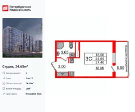 Продается просторная студия от застройщика в жилом комплексе ''Бионика Заповедная'' в динамичном Приморском районе.До метро можно добраться на транспорте всего за 11 минут.Удобная, классическая, функциональная европланировка, просторная прихожая 3.5 м². Общая площадь студии - 24.65 м², жилая 18 м², высота потолка 2.77 м.Квартира продается с отделкой ''Норд Лайн светлый плюс''.Что особенного в ЖК ''Бионика Заповедная''?• Оазис в городе 3 минуты пешком до Новоорловского заказника (140 ГА)• Захватывающие виды из окон на хвойный лесопарк• Всесезонный ''Заповедный парк'' во дворе площадью 23000 кв.м.• 5 единых входных групп с авторским дизайном и лаундж-зонами, сити-виллы на первых этажах с палисадниками и высотой потолков до 4 м• Места притяжения: фонтан ''Бионика'', спортивный кластер со скейт-парком, фотозоны с арт-объектами