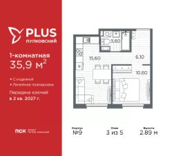 Однокомнатная квартира от застройщика с отделкой в ЖК ''PLUS Пулковский'' на 3 этаже. Общая площадь: 35.9 кв.м., жилая: 10.6 кв.м., площадь просторной кухни-столовой: 15.6 кв.м. Все окна выходят на одну сторону. В квартире один совмещенный санузел. Высота потолков 2.89 м. Дом монолитный, трехподъездный, высотой 5 этажей. Квартира находится в 1-й секции в корпусе 9. На этаже 6 квартир. В подъезде 1 грузовой лифт. Окончание строительства - 2 квартал 2027 года. Оформление сделки по договору долевого участия. Уютный пятиэтажный city квартал PLUS Пулковский расположен в престижном Московском районе на пересечении Пулковского и Волхонского шоссе в новом формирующемся микрорайоне. Рядом проходит одна из важнейших транспортных артерий города Пулковское шоссе, а в 10 минутах езды два въезда на КАД и въезд на ЗСД. Благодаря удобному и быстрому выезду на Пулковское шоссе, можно легко добраться до центра города за 35 мин. До станций метро ''Московская'' и ''Купчино'' - 15 мин. на машине, а до аэропорта Пулково - 17 мин. В составе квартала: 30 пятиэтажных домов, школа со спортивным стадионом, 2 детских сада с бассейнами, наземные и подземные паркинги, центральный зеленый бульвар с play hub и местами отдыха. Благоустройство квартала продумано до мельчайших деталей, в его основе - забота о качестве жизни каждого жителя. Дома возводятся по современной монолитной технологии строительства с вентилируемыми фасадами. Благодаря большим увеличенным окнам и отсутствию высокоэтажных домов, во всех квартирах максимальный объем естественного света. В составе квартала запланированы социально-значимые объекты: школа на 825 мест со спортивным стадионом и бассейнами, два детских сада с бассейнами на 220 мест каждый. Территория квартала зонирована таким образом, чтобы автомобильные и пешеходные потоки и не пересекались. Прогулочные и велосипедные дорожки отделены от автомобильных проездов зелеными насаждениями. Дворы закрыты для машин, что дает чувство дополнительной безопасности для жителей особенно, для самых маленьких. Вся территория квартала безбарьерная. Здесь нет пандусов, резких перепадов высот или неудобных ступеней. Вход в парадные с уровня земли. В каждом дворе есть своя оборудованная детская площадка. А в центре микрорайона расположится большая игровая площадка play hub с пространством для командных игр. PLUS Пулковский располагается в молодом микрорайоне, который сейчас находится в стадии активного развития. Он будет обладать собственной развитой инфраструктурой. В радиусе 15 минут езды на автомобиле располагаются многочисленные магазины, супермаркеты, спортивные, образовательные и медицинские учреждения, парки и достопримечательности. Для автомашин предусмотрены отдельно стоящий 5-ти этажный паркинг на 958 машино-мест, две подземные парковки на 367 машино-мест и наземные парковочные зоны по внешнему периметру микрорайона. #Zmb7wz