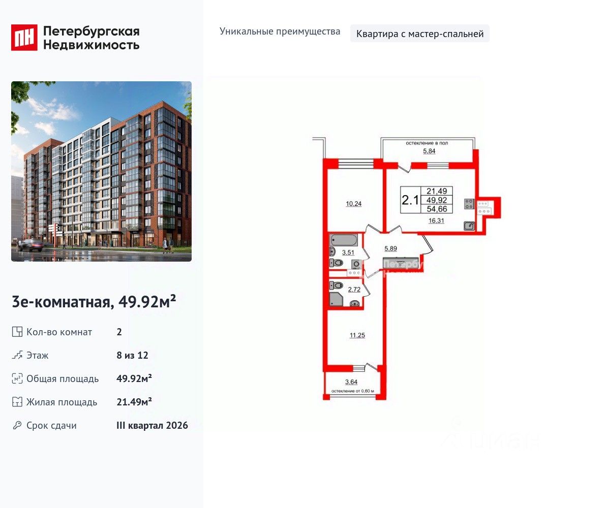 Продается уютная 2-комнатная квартира от застройщика в жилом комплексе ''Титул в Московском'' в престижном Московском районе. До метро можно добраться пешком всего за 25 минут. Мастер-спальня с собственной ванной комнатой. Самое приватное пространство в вашей квартире. Уникальная, функциональная европланировка, большая кухня-гостиная 16.31 м², вместительная прихожая 5.89 м². Общая площадь квартиры - 49.92 м², жилая 21.49 м², высота потолка 2.77 м. Квартира продается с отделкой ''NORD LINE SILVER ВК NEW''. Что особенного в ЖК ''Титул в Московском''? • Престижный Московский район • Авторская архитектурная концепция • 2 центральные входные группы с ресепшн и лаундж-зонами • Кленовая аллея с арт-стеллой, цветочная аллея и сад трав • Уютные дворы-патио, площадки SetlKids и SetlSport • Инновационный Лицей Setl с оригинальной архитектурной концепцией и уникальной образовательной средой