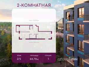 В гп. Дубровка, Всеволожский р-н, Ленинградской обл., продается 2-комн. квартира 8, площадью 60.79 м2 в монолитно-кирпичной новостройке в 20 мин. транспортом от м.Улица Дыбенко. Возможен вариант покупки с использованием ипотечных средств, есть рассрочка, возможна покупка с использованием материнского капитала, есть военная ипотека. Жилая площадь 23.8 м2, кухня 18.25 м2. Площадь комнат: 11.73/12.07 м2, балконов - 1, окна выходят во двор и на улицу. Квартира располагается на 2 этаже 5-этажного дома в ЖК Дубровка.Park. Застройщик - ЛенОблСтрой 47, сдача дома - III квартал 2026 года, высота потолков 2.72 м. Дом оборудован грузовым и пассажирским лифтом. Парковка автомобилей - наземная. Инфраструктура: школа, детский сад, поликлиника, детские площадки, спортивные площадки, места для отдыха, супермаркет, рестораны, фитнес-центр. Жилой комплекс