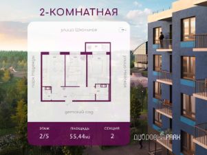 В гп. Дубровка, Всеволожский р-н, Ленинградской обл., продается 2-комн. квартира 37, площадью 55.44 м2 в монолитно-кирпичной новостройке в 20 мин. транспортом от м.Улица Дыбенко. Возможен вариант покупки с использованием ипотечных средств, есть рассрочка, возможна покупка с использованием материнского капитала, есть военная ипотека. Жилая площадь 24.49 м2, кухня 12.9 м2. Площадь комнат: 12.19/12.3 м2, балконов - 1, окна выходят на улицу. Квартира располагается на 2 этаже 5-этажного дома в ЖК Дубровка.Park. Застройщик - ЛенОблСтрой 47, сдача дома - III квартал 2026 года, высота потолков 2.72 м. Дом оборудован грузовым и пассажирским лифтом. Парковка автомобилей - наземная. Инфраструктура: школа, детский сад, поликлиника, детские площадки, спортивные площадки, места для отдыха, супермаркет, рестораны, фитнес-центр. Жилой комплекс