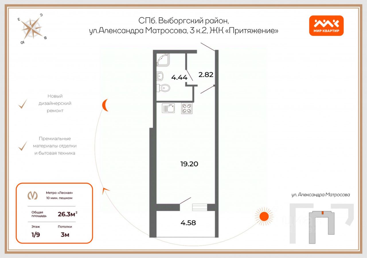 Арт. 108326447 Новая студия с дизайнерским ремонтом, премиальными материалами в ЖК бизнес класса! Уважаемый покупатель, Вы точно влюбитесь в эту студию! Она делалась для себя, поэтому уникальна в каждой детали. Ремонт полностью новый. В квартире ещё не жили: даже матрас в заводской упаковке! В этой студии продумано зонирование пространства: Вы можете отделить кухню от спальни раздвижной перегородкой и приготовить любимое ароматное блюдо, от запаха которого не останется и следа, благодаря мощной вытяжке, или же можете уютно расположиться за барной стойкой, сделанной из массива дуба, наслаждаясь свежесваренным кофе за просмотром сводки новостей по ТВ, меняющего свое направление, благодаря подвижному кронштейну. Вечерами же рекомендуем расслабиться в крутящемся кресле за чтением любимой книгой на лоджии с тёплым полом или же просто насладиться уединением, наблюдая закаты, в панорамных окнах в пол! Шкафы и кухня выполнены из МДФ по индивидуальному заказу с расчетом на максимально эргономичное исполнение пространства. Кухонная техника Bosch подключается к домашнему Wi-Fi, что дает возможность включить духовку с заранее заготовленным блюдом, находясь на пути домой, или же запустить посудомоечную машину, которую забыли включить, убегая по делам. В жаркий летний день Вам поможет охладиться мощный кондиционер Mitsubishi. Он же, кстати, может и согреть в холодную зиму! Привлекательная брашированная сантехника в ванной польского бренда Omnires, известного своими инновационными технологиями с 1990 года. Фарфоровые санузел и раковина элитного итальянского бренда ArtCeram. В связи с использованием исключительно натуральных материалов таких как дубовый паркет, льняные портьеры или же экологичная английская настенная и потолочная краска - в квартире дышится легко и свежо! Подробнее о деталях: Пол - паркет венгерская клочка, дуб, Латвия, Плитка - итальянские и испанские бренды, Потолок - гипсокартон, Портьера (блэкаут) - хлопок, бренд Manders, Тюль - натуральный лён, Manders, Плинтусы - МДФ, Кровать и стулья - российский бренд Rooma, Шкафы и кухня - МДФ, столешница - массив дуба, индивидуальное изготовление, Краска на стенах и потолке - моющаяся, экологичная Little green. Подогрев пола в санузле и лоджии, Светильники - Bezhko и Центрсвет, Холодильник - Franke, Духовка, варочная панель, посудомоечная машина - Bosch, Кондиционер - Mitsubishi, Стиральная машина - LG. Стоимость квартиры указана без бытовой техники! Станьте обладателем этой жемчужины в ЖК Притяжение уровня бизнес класса! Все просмотры по договоренности. Один собственник. Сделку проводим под ключ. Гарантия юридической чистоты! Предлагаем ПРЕМИАЛЬНОЕ обслуживание для требовательных клиентов. Оперативно организуем просмотр, предоставим полную информацию по объекту. 20 лет работы с требовательными клиентами подготовили нас к решению ВАШИХ сложных задач. Будем рады знакомству! Ул. Рубинштейна, д.8.