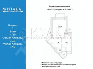 1-91436 Идеальный старт или комфортная жизнь в Выборгском районе! Кирпич, локация, метро! Предлагаем к продаже уютную однокомнатную квартиру общей площадью 39,7 м² в добротном кирпичном доме на проспекте Культуры. Просторная кухня 8 м² место для семейных завтраков и ужинов. Безупречная локация! В шаговой доступности детские сады, школы. Все необходимое рядом. Отличная транспортная доступность: метро ''Политехническая'', всего 10 минут на транспорте Быстрый выезд на КАД, в Центр и другие районы. Надежность: Кирпичные стены тепло, тишина, долговечность. Выборгский район спокойный, зеленый, престижный. Документы готовы к сделке. Полная стоимость в договоре. Прямая продажа.Итака. Работаем с 1993 года.