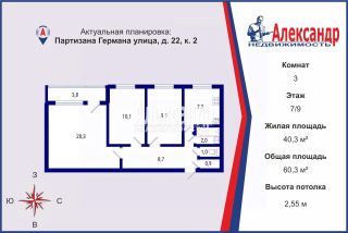 1705341 В прямой продаже просторная трехкомнатная квартира в 10 минутах от ст. м. Проспект Ветеранов.Квартира расположена в Красносельском районе Санкт-Петербурга.Общая площадь 60,3 кв.м, жилая площадь 40,3 кв.м. Все комнаты изолированные: 20,3 м.кв, 10,1 м.кв, 9,1 м.кв. Из большой комнаты выход на застекленную лоджию, кухня 7,2 м.кв квадратной формы, высота потолков 2,55 м. Санузел раздельный, просторная прихожая, есть кладовка. Квартира расположена на 7 этаже девяти этажного дома. Квартира требует ремонта, это дает вам полную свободу в создании квартиры своей мечты, соответствующей личным вкусам и требованиям.Расположение дома позволяет за 7 минут доехать до КАД и за 5 минут дойти до жд. станции Лигово. Ближайшая станция метро Проспект Ветеранов в 10 минутах общественным транспортом, остановка рядом с домом. В пешей доступности от дома находятся магазины, аптеки, почта, пункт выдачи и многое другое, необходимое для полноценной жизни!Один взрослый собственник. Квартира в собственности более 5 лет, обременений нет, прямая продажа, документы готовы к сделке!!! Объект подходит под ипотеку, помощь в одобрении оказываем.