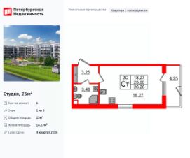 Продается просторная студия от застройщика в жилом комплексе ''Univer City'' в на юге Санкт-Петербурга.До метро можно добраться на транспорте всего за 30 минут.Удобная, классическая, функциональная европланировка, вместительная прихожая 3.08 м². Общая площадь студии - 25.42 м², жилая 18.16 м², высота потолка 2.77 м.Квартира продается с отделкой ''Норд Лайн светлый''.Что особенного в ЖК ''Univer City''?• Малоэтажное строительство• Скандинавские фасады с отделкой керамогранитом, акцентные входные группы• Закрытые внутренние дворы без машин• Пешеходный променад с тематическими зонами, еловый сквер и яблоневый сад• Univer Park, включая SetlSport и SetlKids, площадку для выгула собак и зоны отдыха• Инновационный Лицей Setl с оригинальной архитектурной концепцией и уникальной образовательной средой
