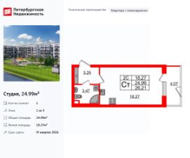Продается просторная студия от застройщика в жилом комплексе ''Парадный ансамбль'' в престижном Московском районе.До метро можно добраться на транспорте всего за 20 минут.Уникальная, функциональная европланировка, просторная прихожая 3.25 м². Общая площадь студии - 24.99 м², жилая 18.27 м², высота потолка 2.77 м.Квартира продается с отделкой ''Норд Лайн светлый''.Что особенного в ЖК ''Парадный ансамбль''?• Инновационный Лицей Setl с оригинальной архитектурной концепцией и уникальной образовательной средой• Масштабное малоэтажное строительство в престижном Московском районе• Рекреационные зоны: парадный парк в центре квартала, ручей с собственной набережной, центральная площадь, ресторанный комплекс и пешеходный бульвар• Фасады из керамогранита и кирпича с яркими и акцентными входными группами• Две самые большие площадки Setl Kids и Setl Sport• Уникальные квартиры.High Flat на последних этажах, палисадники у квартир на первом этаже, семейные секции, квартиры с саунами и окном в ванной