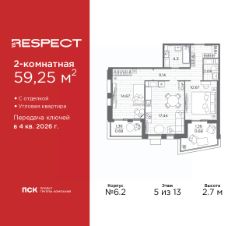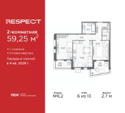 Продается 2-комн. квартира от застройщика с отделкой в ЖК ''RESPECT'' на 6 этаже. Общая площадь: 59.25 кв.м., жилая: 25.34 кв.м., площадь просторной кухни-столовой: 17.44 кв.м. Квартира угловая, идеально подойдет любителям тишины и панорамных видов. В квартире две лоджии, один совмещенный и один раздельный санузел. Высота потолков 2.7 м. Квартира находится в корпусе 6. Дом монолитный, одноподъездный, высотой 13 этажей. На этаже 8 квартир. В подъезде 1 пассажирский и 1 грузовой лифт. Окончание строительства - 4 квартал 2026 года. Оформление сделки по договору долевого участия. В шаговой доступности от жилого комплекса расположены станции метро (расстояние по прямой): ''Лесная'' (800 м), ''Площадь Мужества'' (1.4 км), ''Выборгская'' (1.9 км), также недалеко от этого корпуса расположены станции метро: ''Академическая'', ''Политехническая''. Квартал строится на Полюстровском пр, 87, в одной из самых востребованных локаций Петербурга. В 10 минутах пешком - метро ''Лесная'' и в 10 минутах на транспорте - Петроградская сторона. Высота домов от 7 до 13 этажей. На территории Respect строится школа на 1125 учащихся и детский сад на 240 мест. Запроектированы собственная газовая котельная, закрытая территория, дворы без машин и подземные паркинги с лифтами. Вентилируемые фасады облицованы клинкерным кирпичом. Дома из этого материала служат веками, являясь гордостью хозяев. Дизайн парадных зон и входных групп - сочетание лаконичности отделки и декоративных элементов с текстурами из натурального камня и дерева с приглушенной подсветкой теплым светом. Во входных группах расположены гостевые зоны с мягкой мебелью. Вся территория квартала будет связана единой концепцией благоустройства, разработанной ландшафтным бюро L.BURO. В основе - идея создания увлекательного ландшафтного пространства для насыщенной жизни, включающего в себя пейзажные зоны, современные архитектурные композиции, открытые террасы на стилобатах с зонами отдыха и парклетами, спортивными площадками. Это пространство для людей всех возрастов и различных увлечений. На эксплуатируемой кровле на уровне первого этажа в домах 1 и 4 будут обустроены общественные видовые террасы. В квартале запроектированы внутренние закрытые территории дворов домов без доступа автомобилей и безбарьерная среда для велосипедистов и колясок. Предусмотрены IP-домофония с функцией дистанционного открывания калиток и парадных, а также дистанционный сбор показаний счетчиков и мобильное приложение для жителей. Для безопасности жителей квартала - круглосуточное видеонаблюдение и служба охраны. В каждой квартире предусмотрены внешние корзины для кондиционеров. #zMceoe