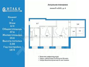 98083913 Продается 2 к.кв. 47,6 м2 у набережной Лейтенанта Шмидта!О доме:Дом культурного наследия дореволюционной постройки с капитальным ремонтом.Перекрытия все железобетонные, стены кирпичные. В парадной всего лишь 13 квартир.О квартире:На этаже всего две квартиры. Квартира светлая, теплая. Шума улицы не слышно.Просторный коридор 6,7 м2, комнаты 15,6+9,0 м2, кухня 6,3 м2,также есть еще один прямоугольный коридор 5,4 м2, в котором можно обустроить гардеробную.О местоположении:Дом расположен в тихом переулке, рядом школа в 1 минуте ходьбы, через дорогу детский сад.Рядом с домом в двух шагах великолепная набережная, с которой открывается вид на все достопримечательности Санкт-Петербурга.Все салюты и мероприятия проходящие в городе будут в шаговой доступности для Вас!До Академии Художеств 6 минут пешком, до Стрелки Васильевского острова и Дворцовой площади 7 минут на транспорте.О сделке:Без обременений. Вся сумма в договоре. Подходит под ипотеку.Один взрослый собственник. Встречная покупка.Звоните, если хотите обрести квартиру рядом с центром города!Итака. Работаем с 1993 года.