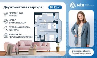 Продается уютная 2-комнатная квартира от застройщика в жилом комплексе ''Бионика Заповедная'' в динамичном Приморском районе.До метро можно добраться на транспорте всего за 11 минут.Мастер-спальня с собственной ванной комнатой. Самое приватное пространство в вашей квартире.Уникальная, функциональная европланировка, большая кухня-гостиная 17.4 м², вместительная прихожая 3 м². Общая площадь квартиры - 51.38 м², жилая 22.07 м², высота потолка 2.77 м.Квартира продается с отделкой ''NORD LINE SILVER ВК NEW''.Что особенного в ЖК ''Бионика Заповедная''?• Оазис в городе 3 минуты пешком до Новоорловского заказника (140 ГА)• Захватывающие виды из окон на хвойный лесопарк• Всесезонный ''Заповедный парк'' во дворе площадью 23000 кв.м.• 5 единых входных групп с авторским дизайном и лаундж-зонами, сити-виллы на первых этажах с палисадниками и высотой потолков до 4 м• Места притяжения: фонтан ''Бионика'', спортивный кластер со скейт-парком, фотозоны с арт-объектами
