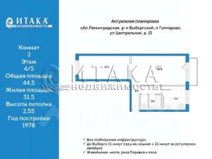 128601277 Продаётся уютная двухкомнатная квартира площадью 44.5 квадратных метров на четвёртом этаже пятиэтажного панельного дома, расположенного в спокойном районе поселка Гончарово. Рассмотрим варианты обмена на город Выборг.Жилая площадь составляет 31.5 квадратных метров, комнаты раздельные (17,4 и 14.1 м2), что предоставляет достаточно места для комфортного размещения мебели и создания индивидуального интерьера. Кухня площадью 5.4 квадратных метров позволит вам с комфортом готовить и проводить время за чашкой утреннего кофе. Наличие раздельного санузла добавляет дополнительное удобство для семейного использования.Из окон квартиры открывается приятный вид на двор, где расположены детская и спортивная площадки идеальное место для отдыха и занятий спортом на свежем воздухе. Для автовладельцев предусмотрена парковка во дворе.Состояние квартиры жилое, чистое. Установлены стекло пакеты. Также имеется балкон, который можно обустроить под зону отдыха или небольшой зелёный уголок.Посёлок с развитой социальной инфраструктурой: рядом находятся детский сад ''Рябинушка'' и школа ''Гончаровская'', а также супермаркет ''Магнит'', 4 магазина, медсанчасть, библиотека, Почта России, Оzоn, 4 детские площадки, игровые поля что делает расположение особенно удобным для семей с детьми.До Выборга 15 минут езды на машине и 25 минут на регулярном автобусе. До Выборга 15 км, до Санкт-Петербурга 120 км. Две остановки возле дома. Живописное место, река Перовка и леса.Этот вариант станет отличным выбором для тех, кто ценит тишину, уединённость и при этом имеет возможность наслаждаться всеми преимуществами благоустроенного жилья.Звоните , заранее записывайтесь на просмотр.Итака. Работаем с 1993 года.Итака. Работаем с 1993 года.