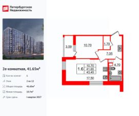 Продается просторная 1-комнатная квартира от застройщика в жилом комплексе ''Бионика Заповедная'' в динамичном Приморском районе.До метро можно добраться на транспорте всего за 11 минут.Удобная, классическая, функциональная европланировка, большая кухня-гостиная 17.5 м², просторная прихожая 7.05 м². Общая площадь квартиры - 41.65 м², жилая 10.7 м², высота потолка 2.77 м.Квартира продается с отделкой ''Норд Лайн светлый плюс''.Что особенного в ЖК ''Бионика Заповедная''?• Оазис в городе 3 минуты пешком до Новоорловского заказника (140 ГА)• Захватывающие виды из окон на хвойный лесопарк• Всесезонный ''Заповедный парк'' во дворе площадью 23000 кв.м.• 5 единых входных групп с авторским дизайном и лаундж-зонами, сити-виллы на первых этажах с палисадниками и высотой потолков до 4 м• Места притяжения: фонтан ''Бионика'', спортивный кластер со скейт-парком, фотозоны с арт-объектами