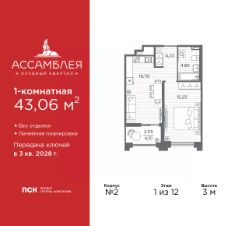 Однокомнатная квартира в Клубный квартал ''Ассамблея'' на 1 этаже. Квартира без отделки, полностью готова к чистовой отделке и дальнейшему ремонту. Общая площадь: 42.86 кв.м., жилая: 14.93 кв.м., площадь просторной кухни-столовой: 17.1 кв.м. Все окна выходят на одну сторону. В квартире одна лоджия, один совмещенный санузел. Высота потолков 3.0 м. Дом монолитный, трехподъездный, высотой 12 этажей. Квартира находится в 3-й секции в корпусе 4. На этаже 9 квартир. В подъезде 1 пассажирский и 1 грузовой лифт. Начало строительства - 3 квартал 2025 года. Окончание строительства - 3 квартал 2028 года. Оформление сделки по договору долевого участия. В шаговой доступности от жилого комплекса находятся станции метро (расстояние по прямой): ''Горный институт'' (1.0 км), ''Василеостровская'' (1.4 км), ''Приморская'' (1.5 км), также недалеко от этого корпуса находятся станции метро: ''Спортивная'', ''Чкаловская''. ''Клубный квартал Ассамблея'' — проект бизнес-класса на Васильевском острове, в самом сердце исторического Петербурга. Комплекс состоит из пяти корпусов переменной этажности — от 7 до 12 этажей — с выразительной архитектурой в стиле неомодернизма: светлый клинкер, панорамное остекление, просторное лобби с потолками высотой почти 8 метров. Потолки — до 3,2 метров. Подземный паркинг на 667 машиномест. Комфорт и инфраструктура Проект ориентирован на комфортную городскую жизнь. В закрытом дворе — ландшафтное озеленение, современные детские и спортивные площадки. Внутренний клуб для резидентов включает коворкинг, переговорные, кинозал, фитнес и бьюти-зону. IP-домофония с просмотром камер видеонаблюдения, дистанционное открывание дверей и доступа на территорию и в парадную со смартфона и планшета, просмотр показаний счетчиков, приложение для жителей PSK Home. Локация Расположение на Васильевском острове — сильная сторона проекта. До четырех станций метро (''Горный институт'', ''Василеостровская'', ''Спортивная'', ''Приморская'') — 515 минут пешком. В шаговой доступности — зелёные зоны, культурные учреждения, в том числе сад ''Василеостровец'' и ДК имени Кирова. Основные магистрали Большой, Средний и Малый проспекты, Наличная и Уральская улицы. Съезд на ЗСД расположен недалеко от станции метро ''Приморская'', близ береговой линии. Благовещенский и Дворцовый мосты соединяют остров с центром города, а мосты Тучков, Биржевой и Бетанкура — с Петроградской стороной. Застройщик Группа компаний ПСК является одной из ведущих девелоперских компаний Санкт Петербурга. На протяжении 18 лет она возводит в Северной столице качественное жилье премиум, бизнес и комфорт-класса, социальные объекты школы и детские сады, апарт-отели и торговые центры. Является шестикратным обладателем золотого знака ''Надежный застройщик России''. #2mIC2S